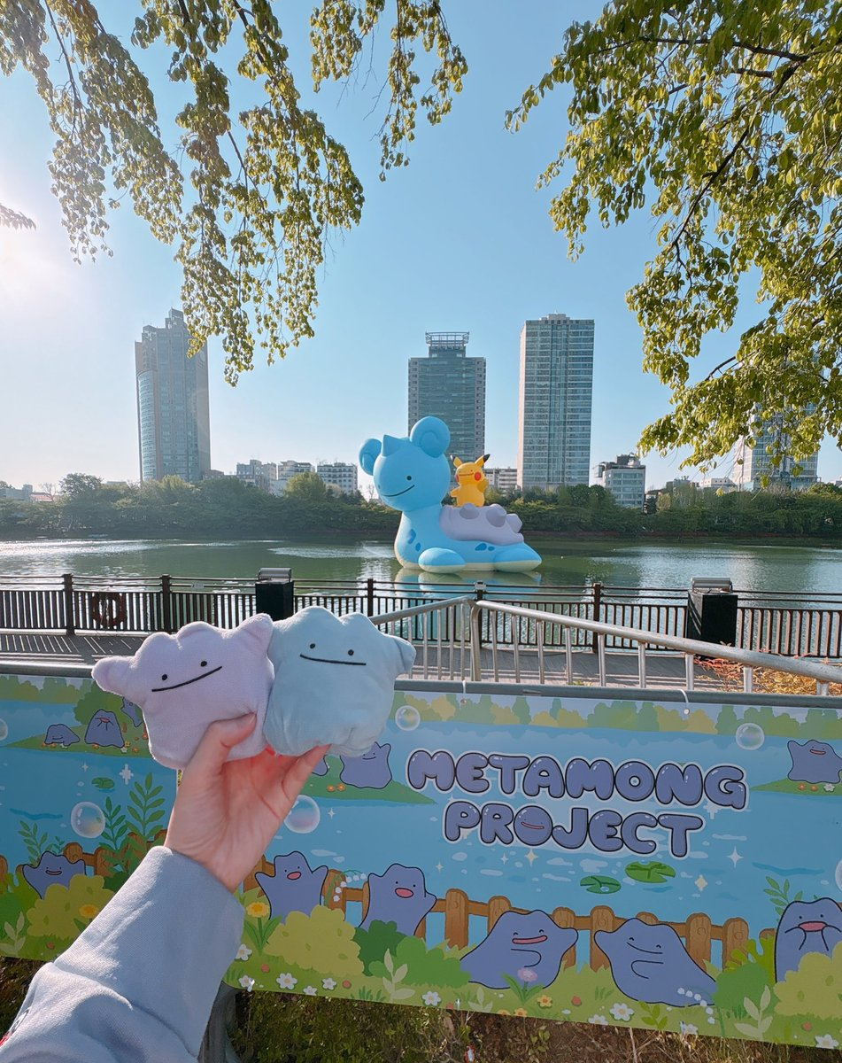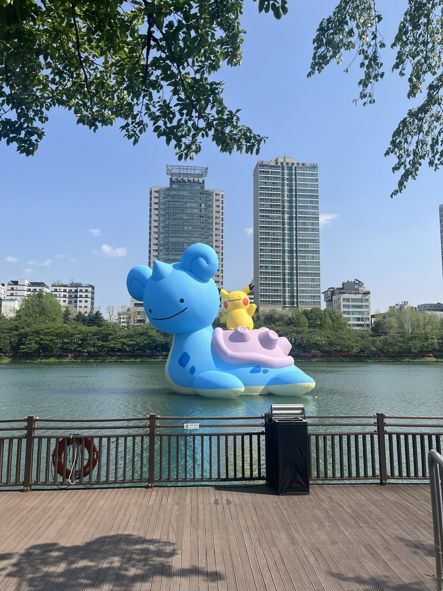 以及由百變怪化身的巨型皮卡丘乘坐在拉普拉斯身上的巨型充氣設施漂浮在石村湖上,超級可愛的 !