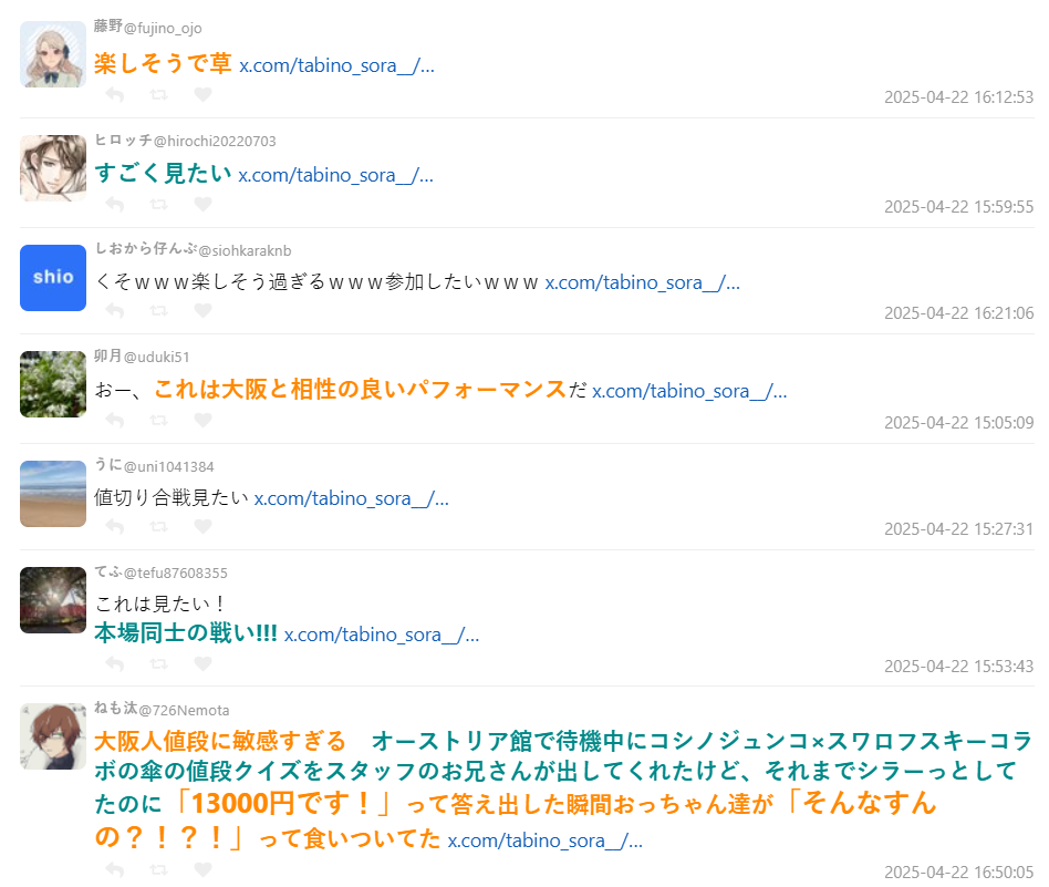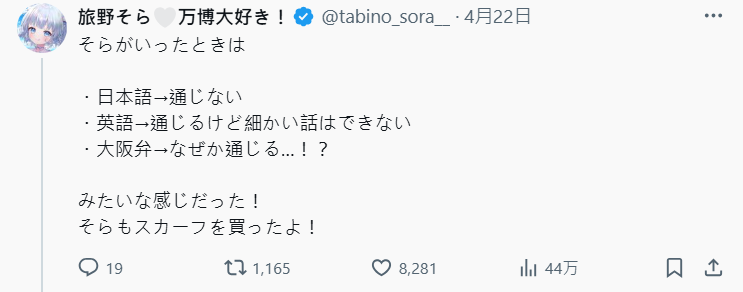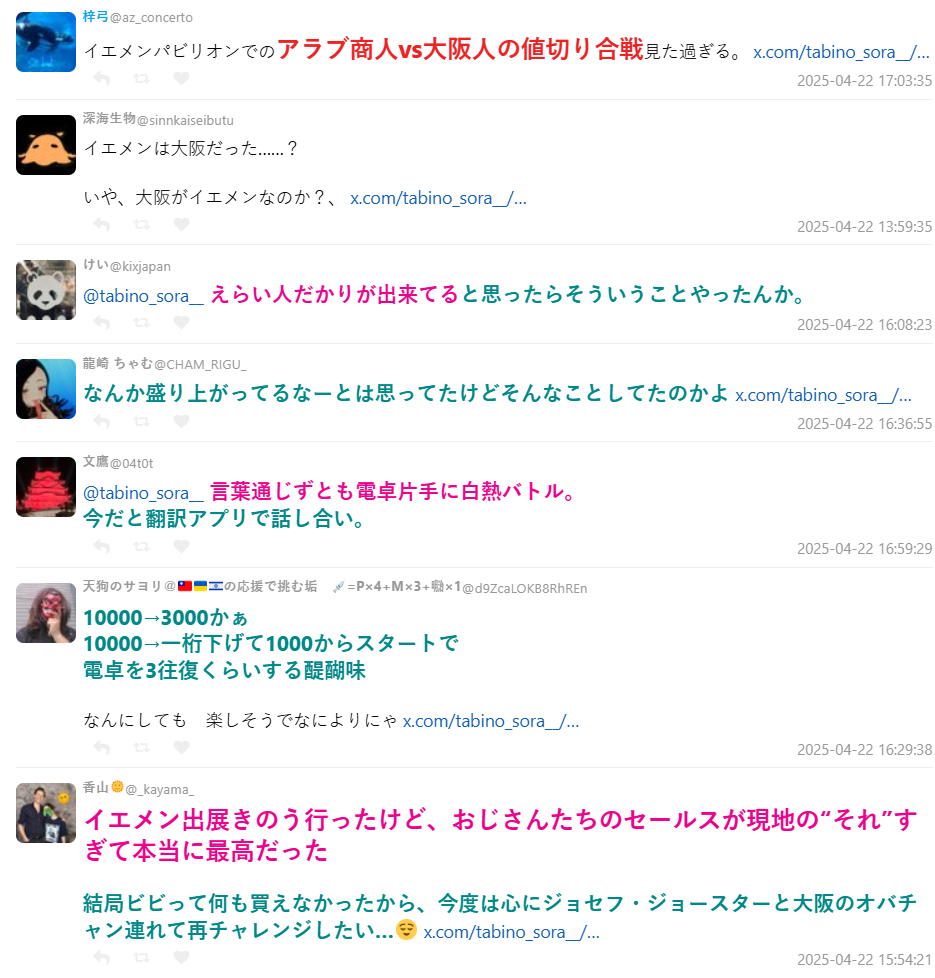 發文引起關注的是從烏克蘭歸國,前戰地記者的 VTuber 旅野そら,她到世博的葉門攤位大吃一驚,現場就跟當地一樣展現殺價風情,不少大阪人也跟著這個風格在攤位買東西,時常出現這樣的景象 :