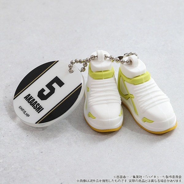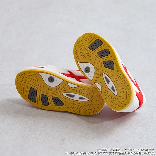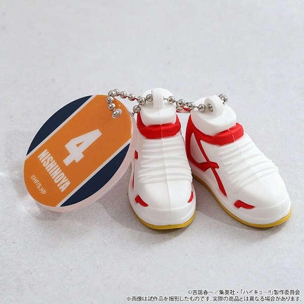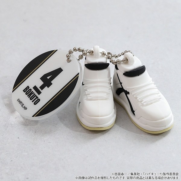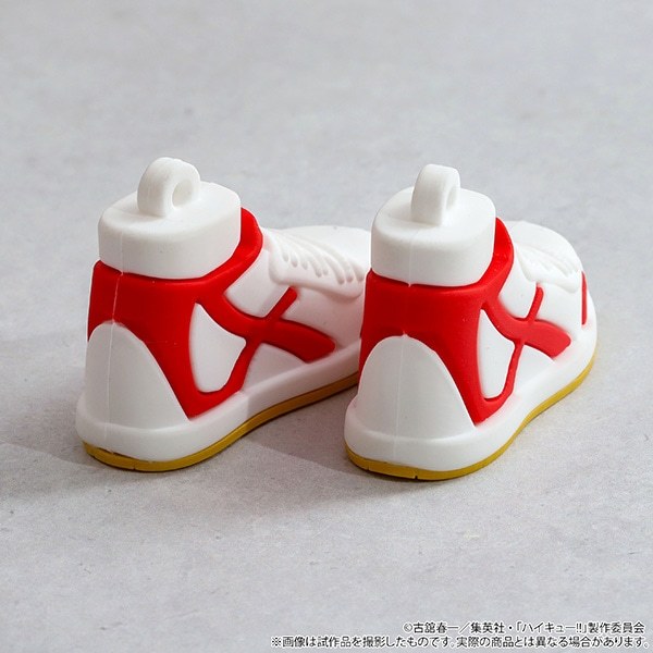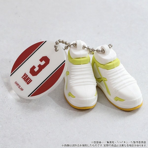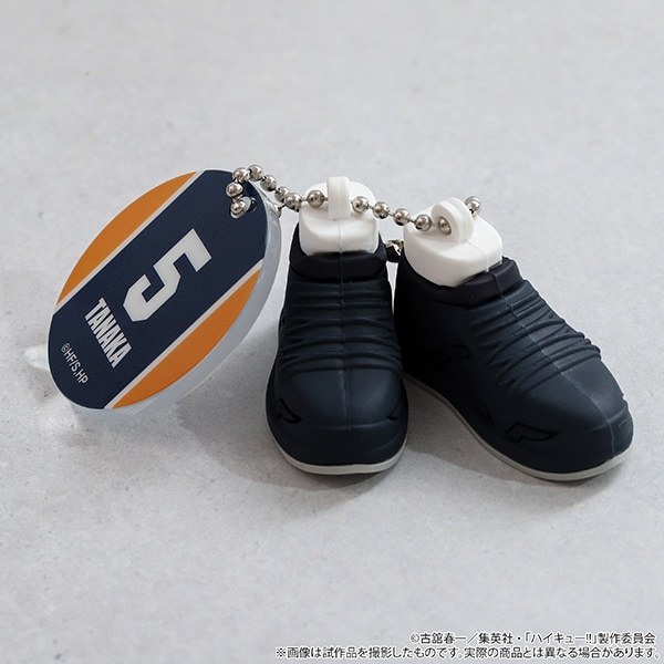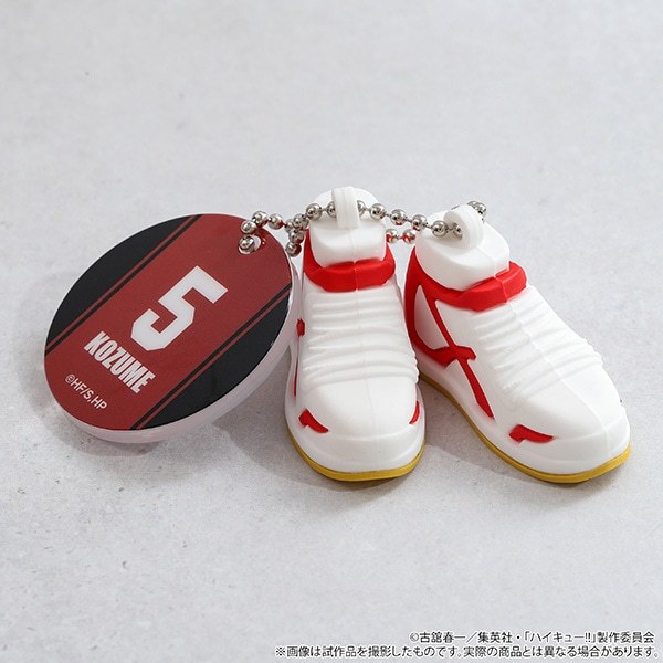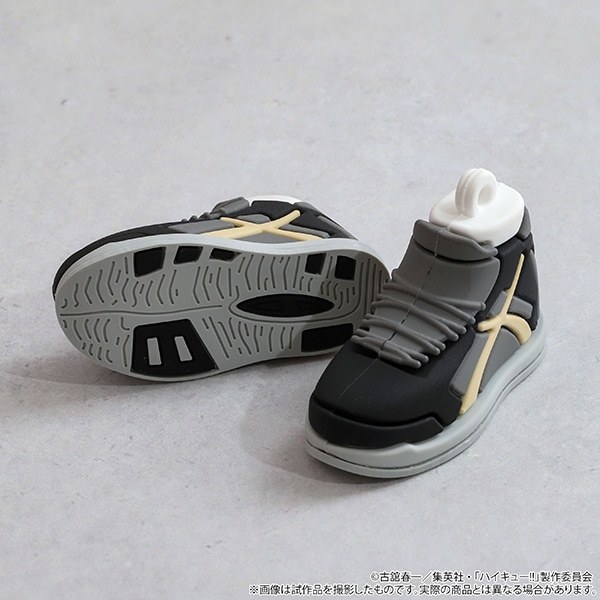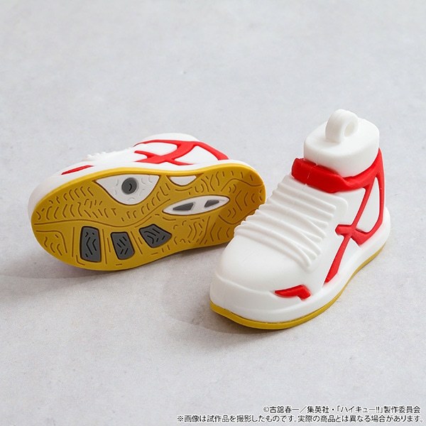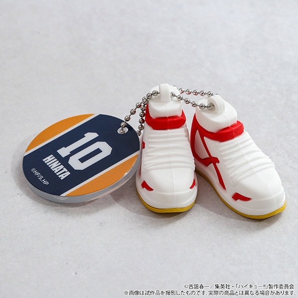 本次的「《排球少年!!》迷你運動鞋收藏」吊飾將作品中人氣球員們的排球鞋製作成約4.5公分的橡膠吊飾,收錄烏野的10號日向翔陽、9號影山飛雄、11號月島螢、4號西谷夕、5號田中龍之介;音駒的1號黑尾鐵朗、5號孤爪研磨、3號夜久衛輔;以及梟谷的4號木兔光太郎、5號赤葦京治共10種款式,在小比例下以簡單的造型還原模仿ASICS打造的排球鞋,連大底的紋路也細緻再現!每款都在球鍊上附有對應球員球衣背號造型的牌子,且都有專用的迷你鞋盒可以收納,各位球員家屬們千萬不要錯過!