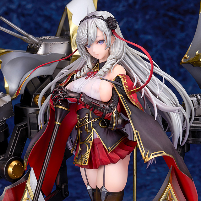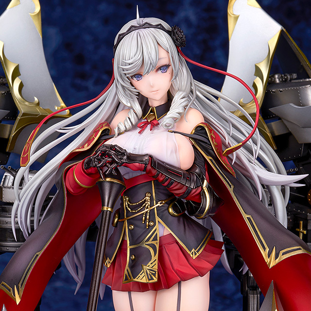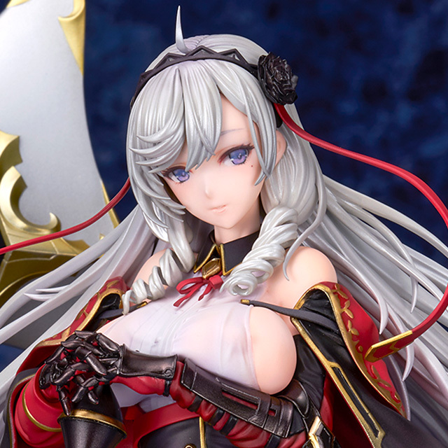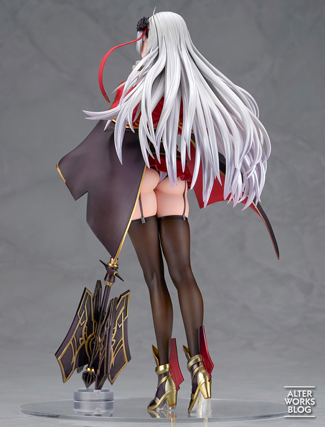 「ALTER 阿爾及利亞」1/7比例模型,由原型師田中冬志精心打造,尺寸約高 27 公分(含艦裝),完美刻劃阿爾及利亞手持權杖的高雅造型~服裝的細節也精緻還原,以黑色和紅色為基礎,飾有金色線條和裝飾;類似騎士的盔甲、手甲等處也透過金屬質感塗裝表現出堅硬質感與豐滿的胸部、大腿散發出的柔軟形成對比。透膚塗裝技術細膩展現若隱若現的大魅力!纖細的雙腿、緊實的腰肢等出眾的身材比例都被完美地再現。銀色長髮經過精心雕琢,獨特的垂直捲髮和在風中輕輕飄揚的細髮進一步增強美麗與優雅~