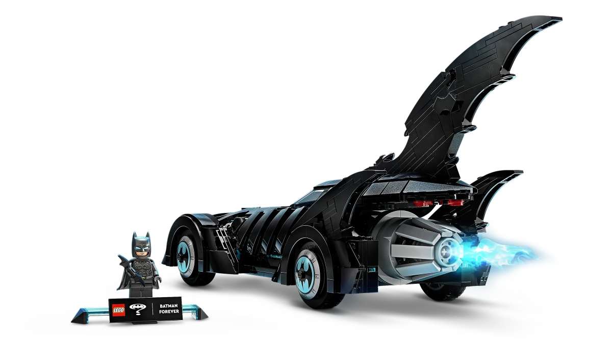 本作一共有 909 片零件,組完之後的蝙蝠車高約 17 公分,長度則來到 41 公分,充分再現了那片搶眼的黑色蝠翼、車身兩側的構造、侵略感極強的銳利車頭,以及車屁股的噴射口,而帶有透藍視覺效果的擋風玻璃、施以蝙蝠標誌的輪圈是令人期待的特殊零件,駕駛艙頂蓋也能夠打開。加上方·基墨版本的蝙蝠俠人偶、點綴了《蝙蝠俠3》電影 LOGO 的展示名牌,擺起來實在有夠帥!