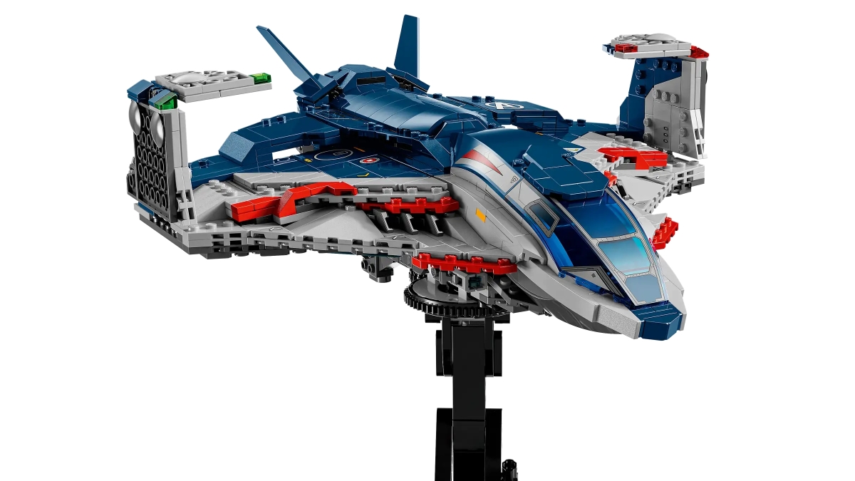 接著,我們又一次地迎接了不知道第幾台的昆式戰機(Quinjet)!本次是根據電影《復仇者聯盟2:奧創紀元》設定製作的版本,擁有 1131 片零件,組完之後翼展來到 45 公分,含支架的高度則是 28 公分。這台以紅藍灰三色為主調的昆式戰機配備了可取下的駕駛艙頂蓋、能讓摩托車衝出去的可掀式後艙門、兩處子彈發射裝置,以及可折疊的機翼。利用黑色支架、透明件則能夠更具躍動地展示黑寡婦、鋼鐵人、快銀、鷹眼、奧創這五款人偶。