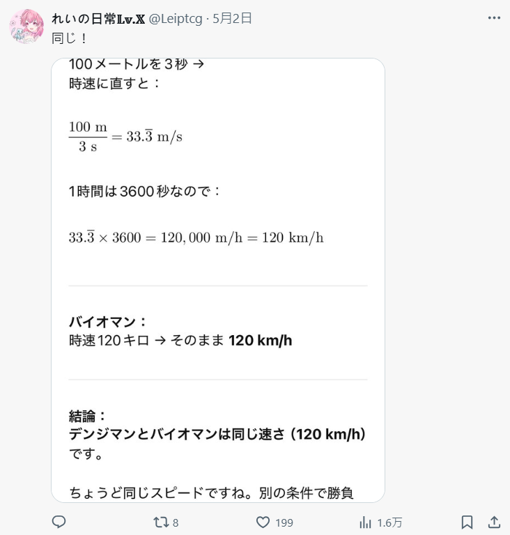 藝人兼歌手的中川翔子最近在 X 發了一篇貼文:「電子人跟生化人,你覺得誰跑得比較快?」這個問題一丟出來,立刻引來一大票網友粉絲熱烈回覆,留言區瞬間變成激烈的理科討論現場。