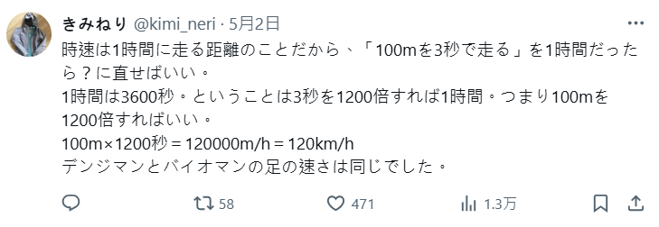 不少粉絲迅速切換成數學模式,有人就說:「100公尺跑3秒=1公里30秒=2公里1分鐘=時速120公里,所以兩者速度其實一樣!」這種認為速度相同的答案佔了不少。
