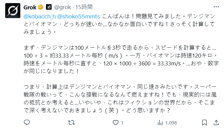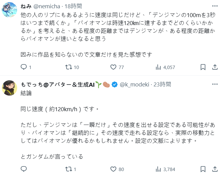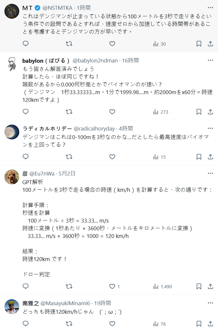 面對大家的神計算與熱情回覆,中川也驚呼:「太厲害了吧!居然有人幫忙算出來~結果電子人跟生化人速度差不多!你們太強了啦!」