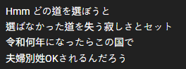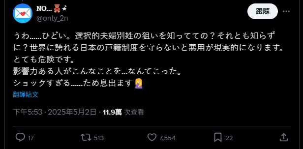 「哇……太過分了。你是明知道選擇性夫婦別姓的用意,還是根本不了解呢?如果不守護日本這個足以引以為傲的戶籍制度,真的會被有心人加以濫用,這非常危險。有影響力的人竟然會說出這種話……真是難以置信。」