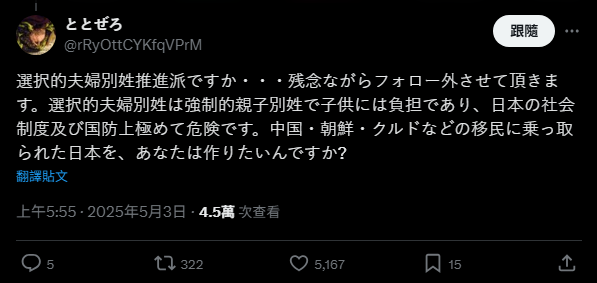「您是選擇性夫婦別姓的推進派嗎……很遺憾,我將取消關注。選擇性夫婦別姓會導致強制性親子別姓,對孩子來說是一種負擔,而且對日本的社會制度和國防來說是極其危險的。您是希望創造一個被中國、韓國、庫爾德等移民所佔領的日本嗎?」