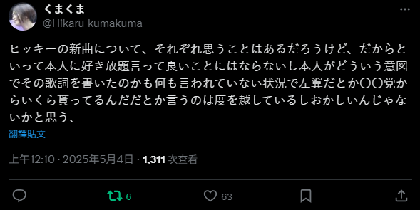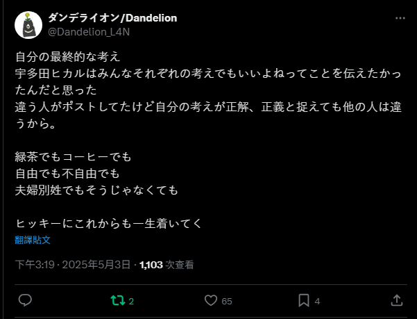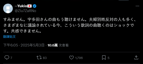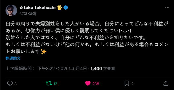 就連曾經參與新版《traveling》以及《Gold》Remix製作的音樂人高橋拓,也在X(前Twitter)表示:「如果我身邊有人選擇夫婦別姓,對我自己會有什麼不利益嗎?我想請大家用溫柔一點的方式幫我解釋,因為我的想像力有點貧乏 (・◡・)」