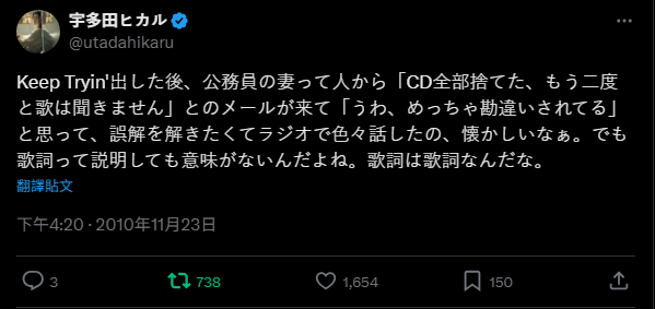 這並非宇多田首次因歌詞惹議,宇多田光曾回憶,2006年推出單曲〈Keep Tryin'〉後,一位自稱公務員妻子的聽眾寄信表示:「我把妳的CD都丟了,以後也不會再聽妳的歌。」