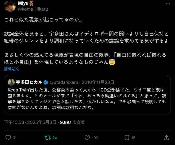 宇多田光早有前例:「歌詞不等於立場宣言」