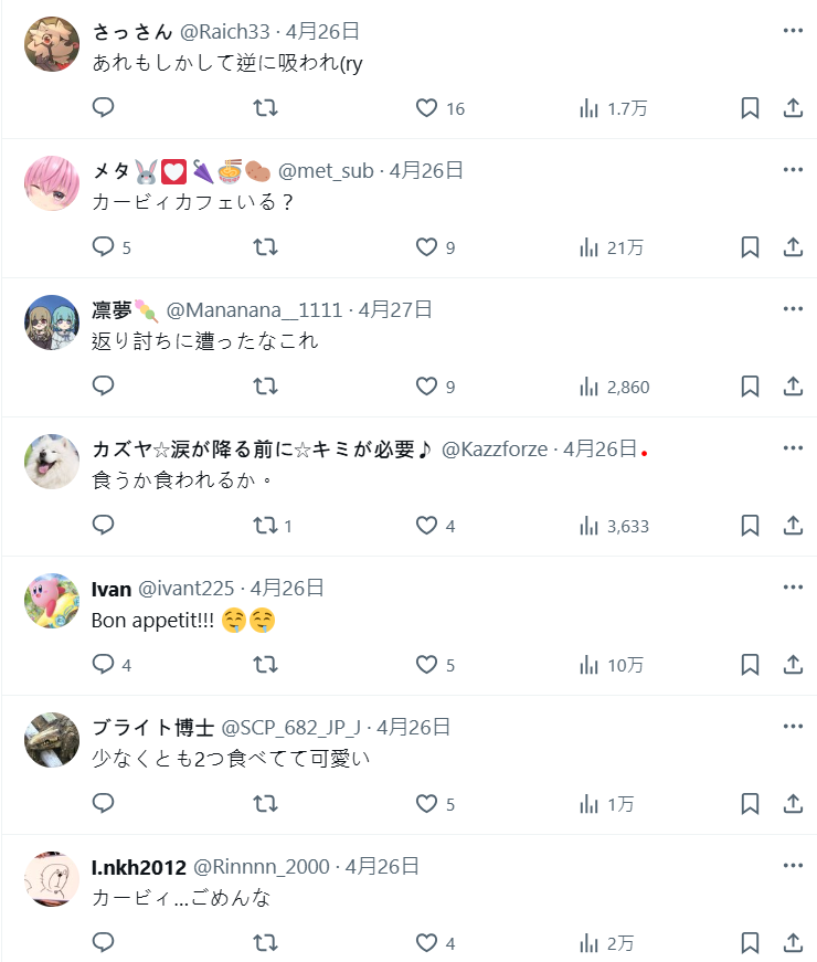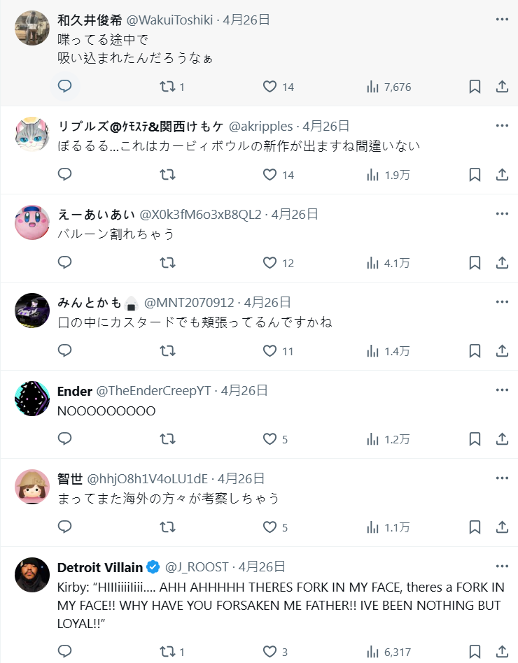 貼文一出,一堆粉絲都跑來猜測這到底是什麼情境,有人說:「原來卡比這隻貪吃鬼也有被吃的一天啊?」、「創作者竟然吃掉自己創造出來的角色,這劇情有點猛」,也有人緊張兮兮地說:「該不會是講到一半就被卡比反吃了吧?」、「這感覺像是反殺欸,櫻井先生還好嗎?」。
