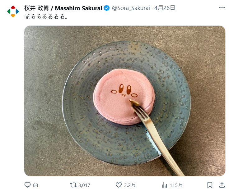 不過櫻井政博最近在 X 上發了一篇貼文,內容是他拿到了一款跟自己親手創作的角色「卡比」造型的甜點,結果這則看似平凡的發文不但突破 1100 萬次瀏覽,還引發大批遊戲迷的騷動,按讚數也突破 29 萬。