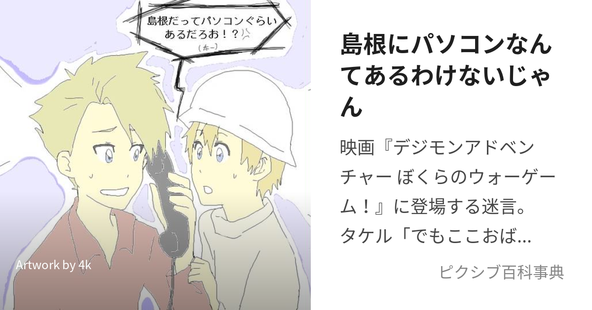 在《數碼寶貝大冒險 我們的戰爭遊戲》劇中,阿和(石田大和)跟阿武(高石武)剛好去島根找阿嬤玩,雖然隨身帶著進化用的「神聖計畫」,但那時候網路不像現在這麼普及,他們想上網幫忙卻找不到電腦。這時就出現了太一那句經典名台詞:「果然島根怎麼可能有電腦啦~~」