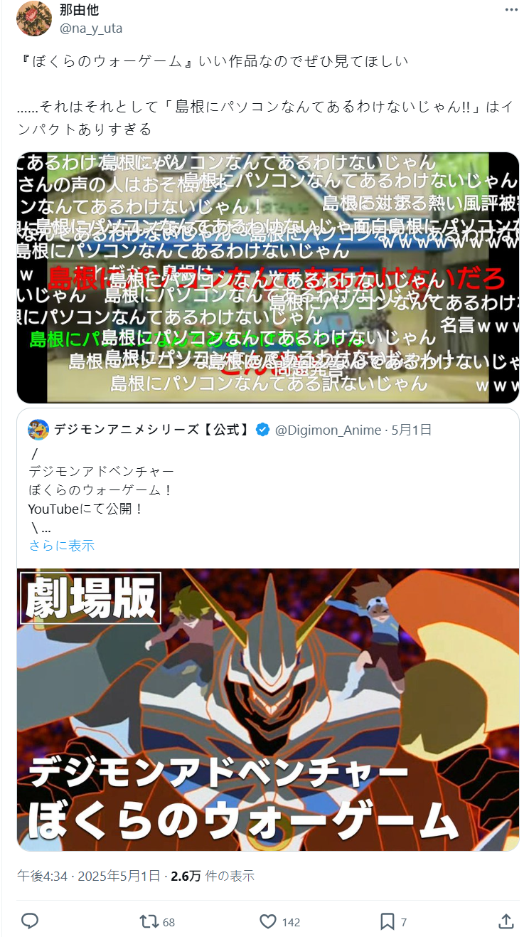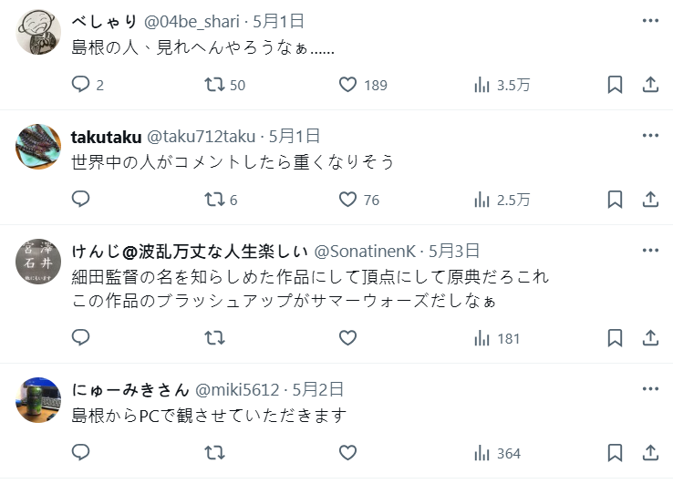近日官方也將這部劇場版上架到官方 YouTube,以兩週期間限定的方式讓大家觀看 ( 不過僅限日本地區 ),官方 X 一發布消息就引來大量討論,但其中也有一個讓人哭笑不得的聲音浮出來:「欸欸欸,島根的人看得到嗎?」為什麼突然擔心島根呢?其實這背後有個超經典的梗。