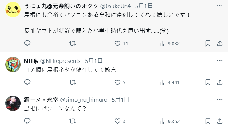 雖然島根縣對不少人來說算是日本鄉下地方,當年日本家用電腦的普及率大概才 40% 左右,要說阿嬤家找不到電腦也非不合理。不過這句「島根怎麼可能有電腦啦~~」當時可讓島根人不太開心,且當時日本程式語言「Ruby」就是在島根作為中心,難怪島根人聽到這種梗會爆氣!