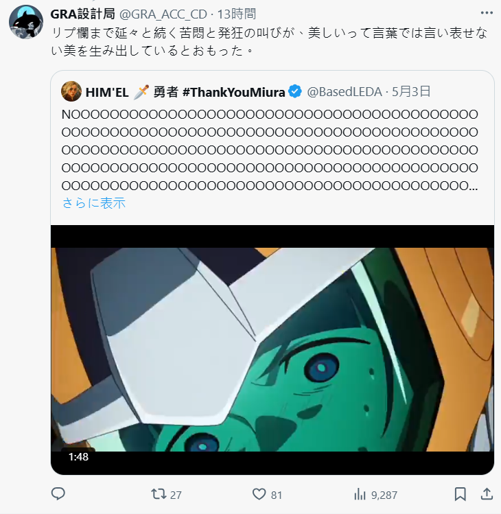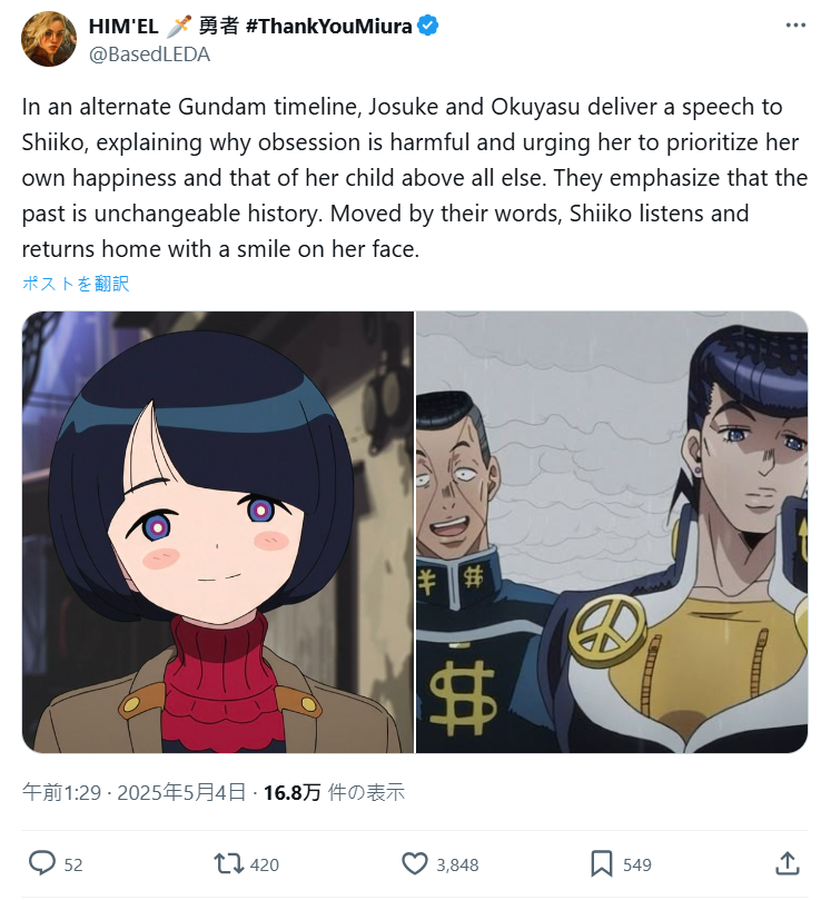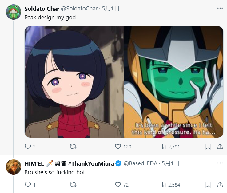 有名海外推主,因為看到繪師ボーグ研究所 ( @borgbattlerT ) 繪製的詩子菅井,在 X 上發文表示,看到了這個決定開始看《機動戰士Gundam GQuuuuuuX》。