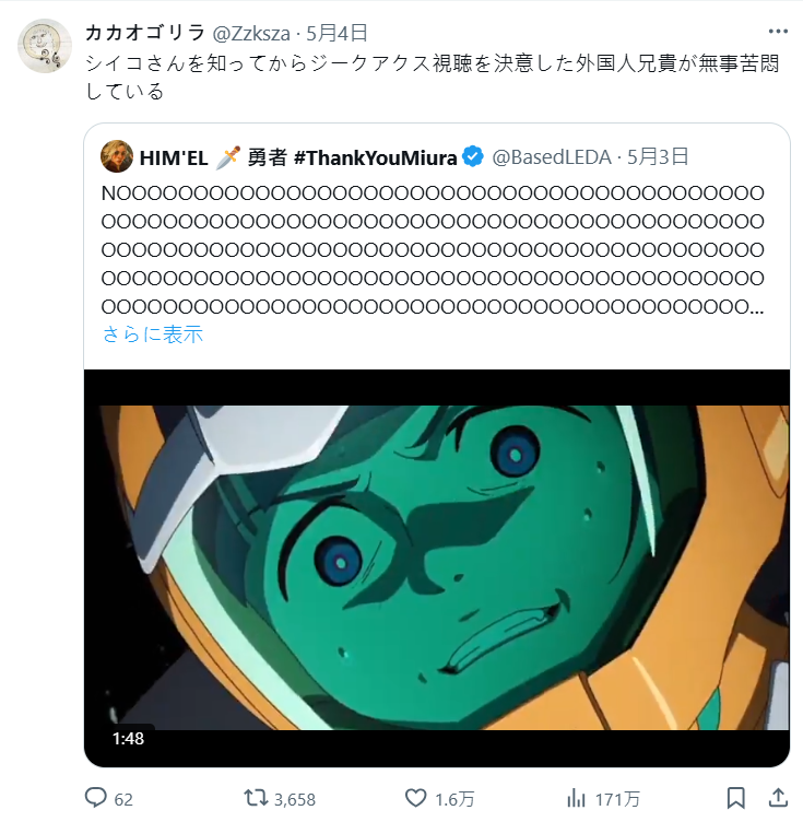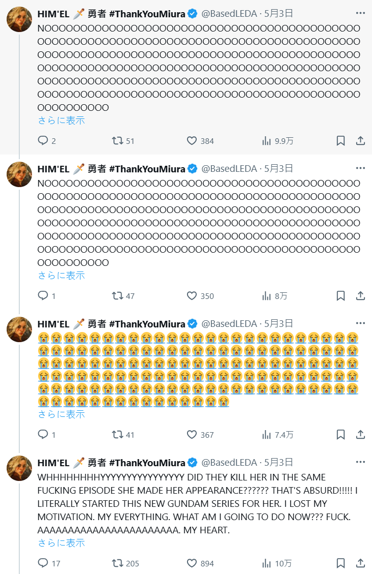 當然要像推主這樣連續發文崩潰或許有點誇張,不過也看到對這名海外網友來說,鋼彈或許還是太苦了吧 ( ? )。
