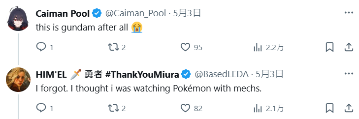 也有網友安慰他說這畢竟是鋼彈作品,會死人也是不太意外,推主則回應自己以為在看有機器人的寶可夢...,太苦了QQ。