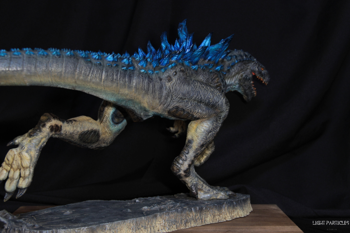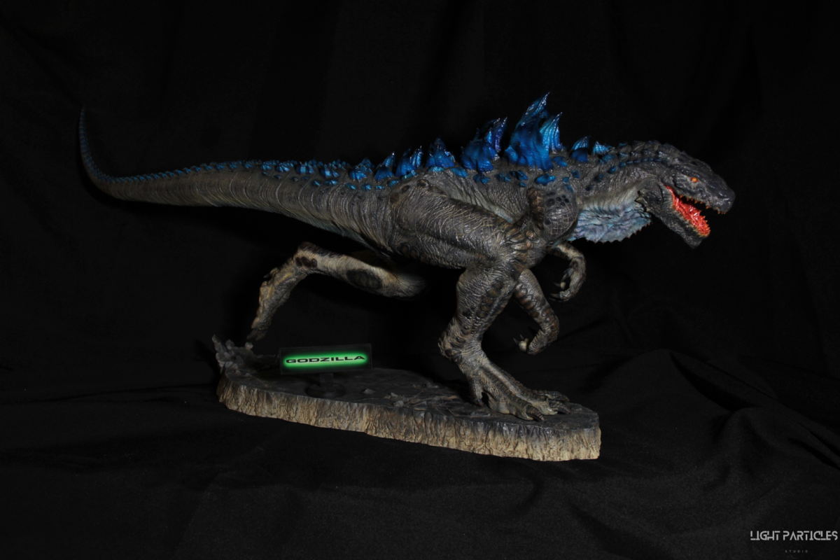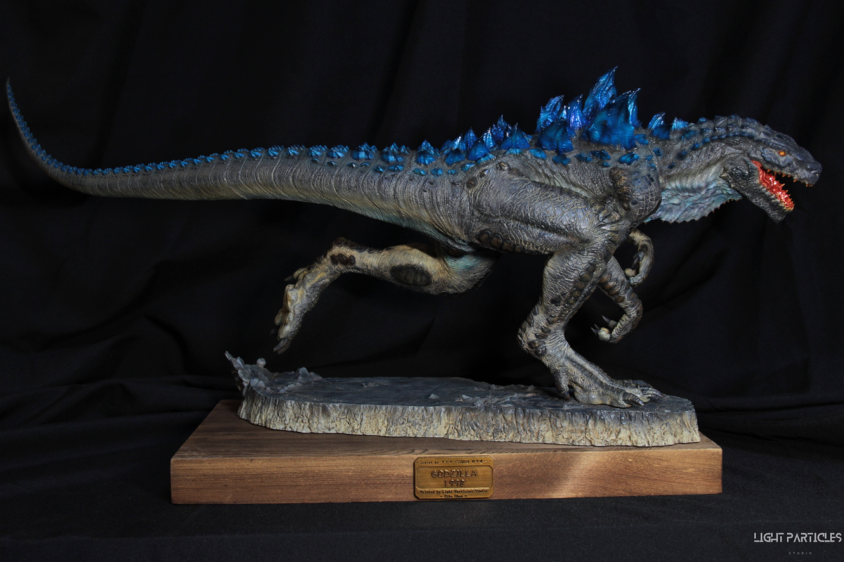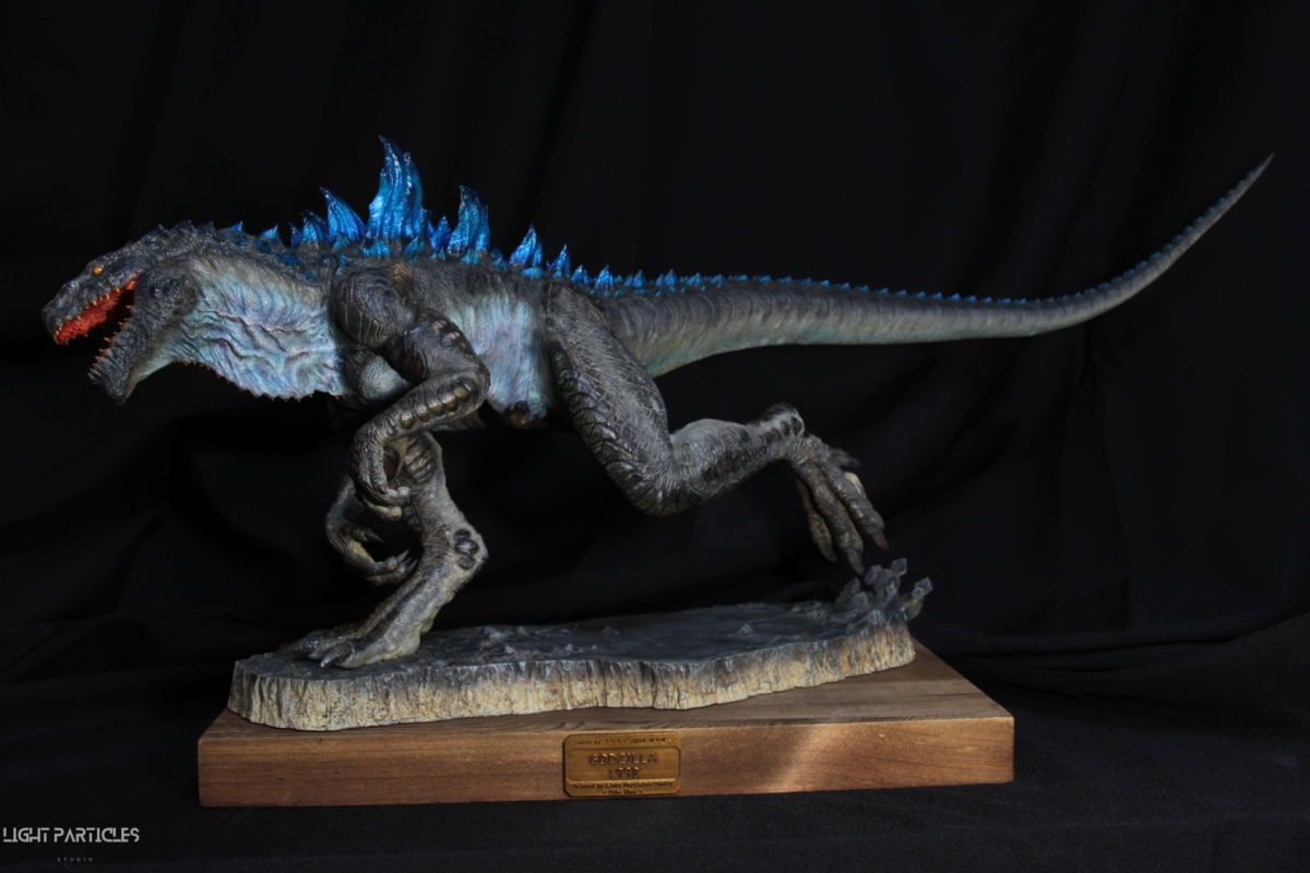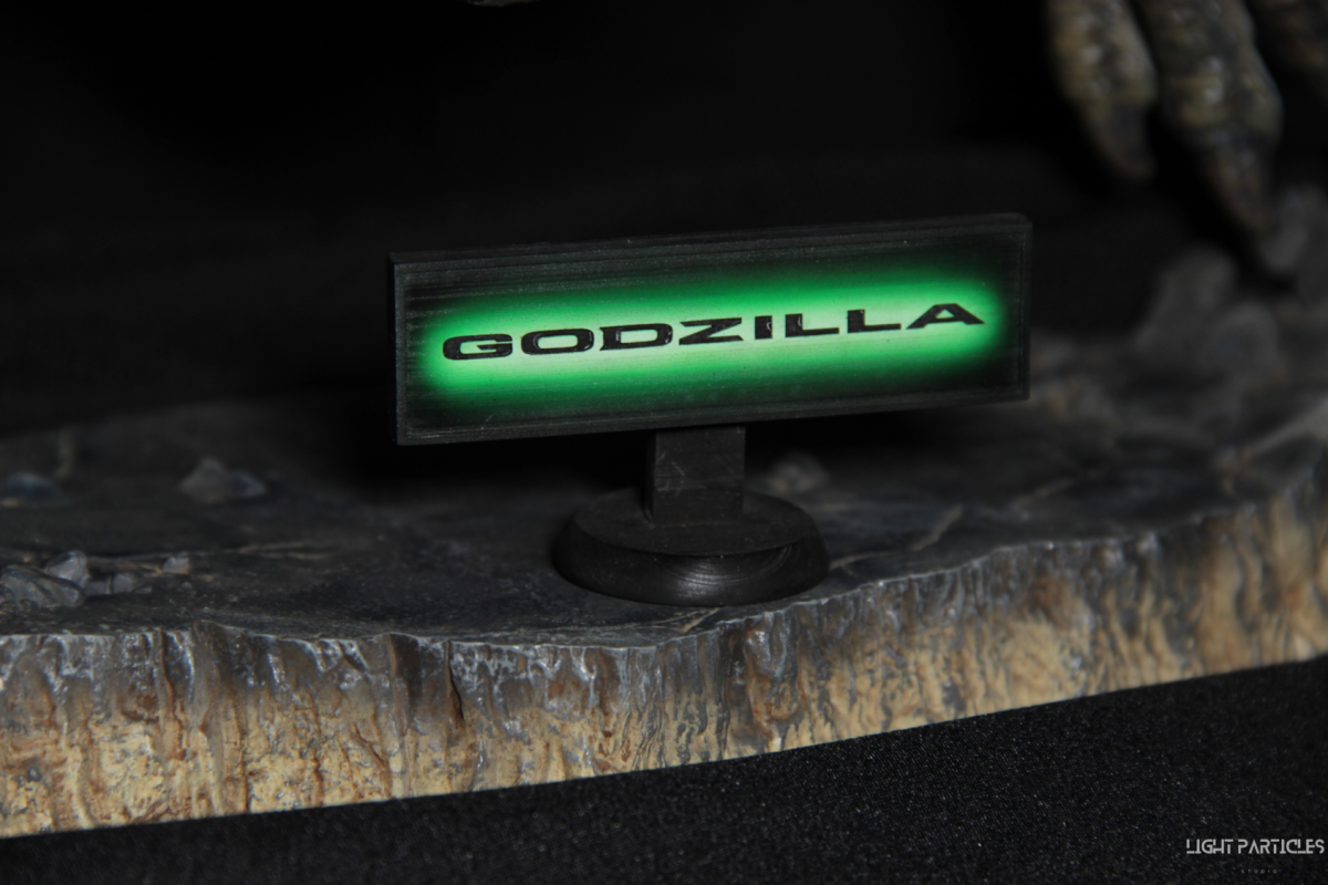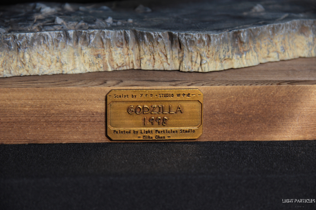這部電影在我小時候上映,當時對長得像恐龍的生物非常著迷,對電影中的酷斯拉表現沒有太多想法,長大後才知道這部電影當時的評價非常慘。隨著時間的推移,慢慢地喜歡上酷斯拉的生物感。這組由田中健一老師雕塑的酷斯拉就被我買回來了,沒有為了空間而改變尾巴的直線設計,讓這組套件長度來到65公分。奔跑的動作感設計再加上一組地台作搭配,讓整體展示性更加。塗裝部分參考大量照片以及作例,最終塗裝效果以這組照片呈現。搭配設計的銘牌,電影logo以及木製底座讓展示效果更有彈性且完整,希望大家喜歡~