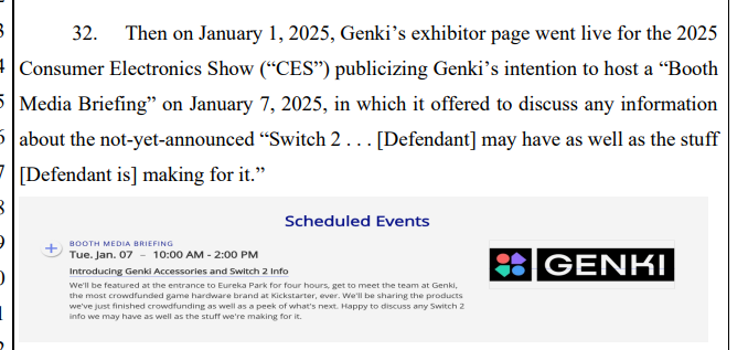 根據美國加州法院公開的法律文件,任天堂指稱 Genki 自 2024 年 12 月起展開一場策略性行銷活動,試圖藉由 Switch 2 尚未公開前的高度關注,提升其產品的曝光與銷售。任天堂表示,Genki 在 2025 年 1 月的 CES 展會中公開展示了據稱與 Switch 2 相容的配件,並聲稱其已取得尚未發表的主機實機,甚至允許現場來賓實際測量模型尺寸。