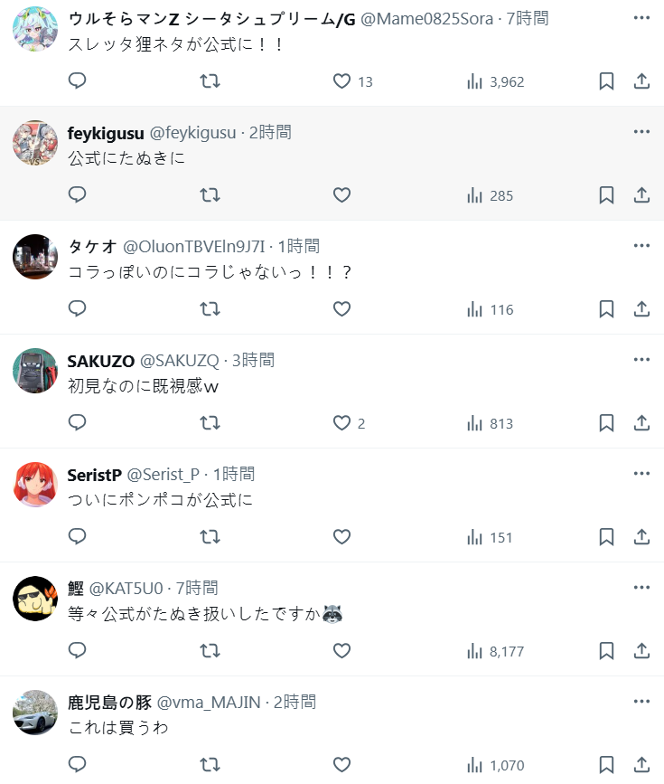 沒想到這次合作居然促成這樣的姿態,雖說紅色的泡麵稱作「きつねうどん」(狐狸烏龍麵),綠色則是「たぬきうどん」(狸貓烏龍麵),剛好將兩者互調,變成隊應的姿態,也讓不少粉絲直呼官方用心。( 但亦有網友發現合作圖似乎蘇萊塔的尾巴比較像是浣熊 )