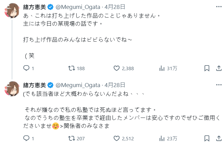 並也強調這不是針對某部作品的慶功宴,而是當天剛好在某個現場看到的一些狀況,所以想提醒新人們注意。