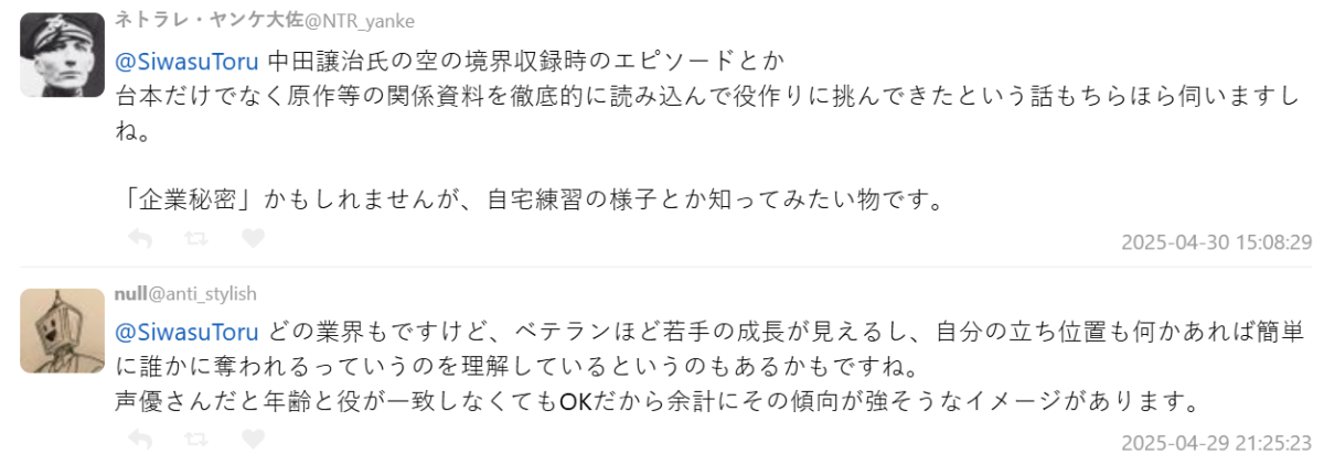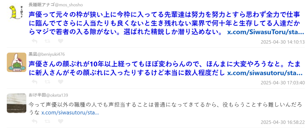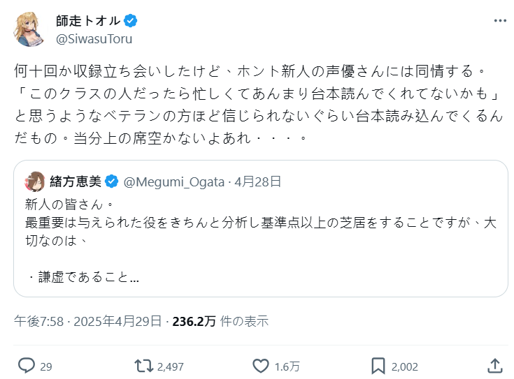 這番話也引來了小說家師走トオル轉推感慨表示,自己參與錄音現場數十次,真的會同情新人聲優,因為「越是大咖、越讓人以為他們忙到沒空看劇本的人,反而越是把劇本讀到徹底」。他直言:「這樣的狀況,短期內上面的位置根本不會空出來。」,