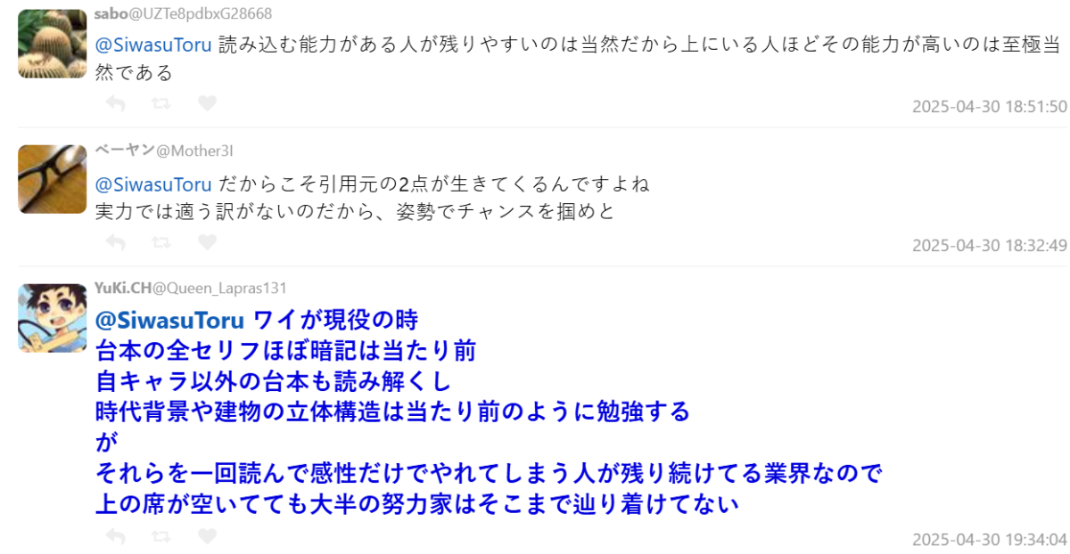 許多網友與業界人士也加入討論,指出:「能把劇本讀透的能力就是一種淘汰機制,能留下來的資深聲優本來就超強。」、「有些人不只背熟自己的台詞,還會研究歷史背景、建築結構,甚至一讀就能憑直覺精準演出。」、「新人連怎麼讀劇本都還在學,遇到這種前輩只能說壓力山大。」