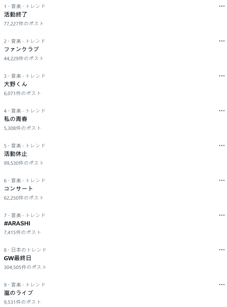 消息一公開後 X 趨勢就湧現「活動終了」、「粉絲俱樂部」、「我的青春」等關鍵字熱搜,不少粉絲感嘆自己的青春就跟著嵐一起成長,現在他們宣布解散跟粉絲告別,也象徵自己的青春逝去。