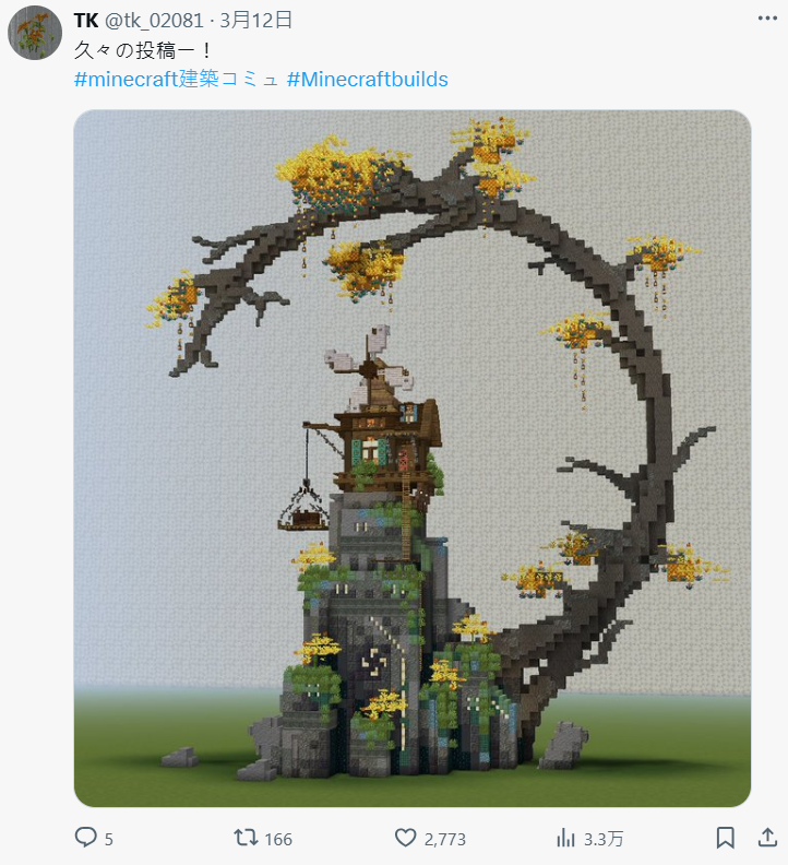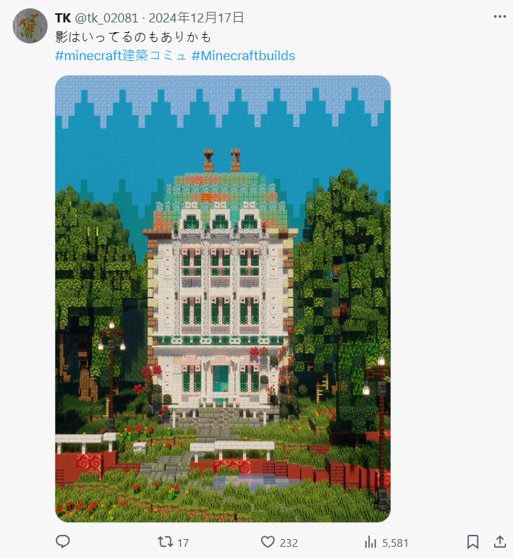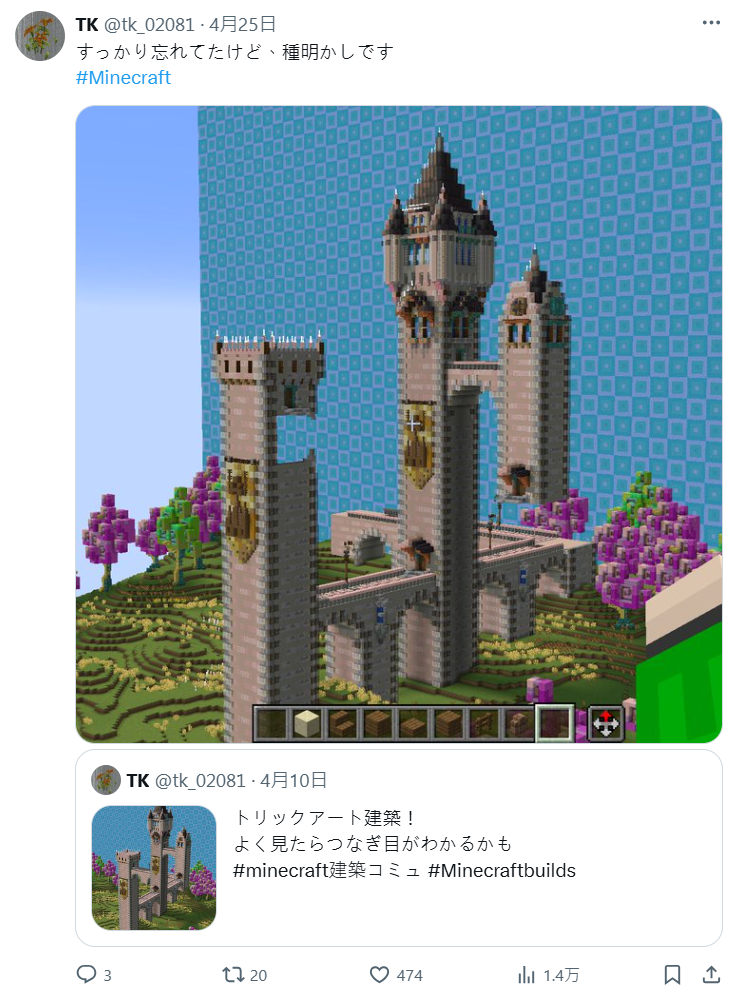 除了這次的 3D 錯覺建築,TK 還蓋過彎曲的大樹、日式建築、教堂等等超多風格多變的作品,對這類建築有興趣的人可以去追蹤他的帳號(@tk_02081),或許可以給你在玩麥塊蓋東西的時候一點創意靈感喔 !