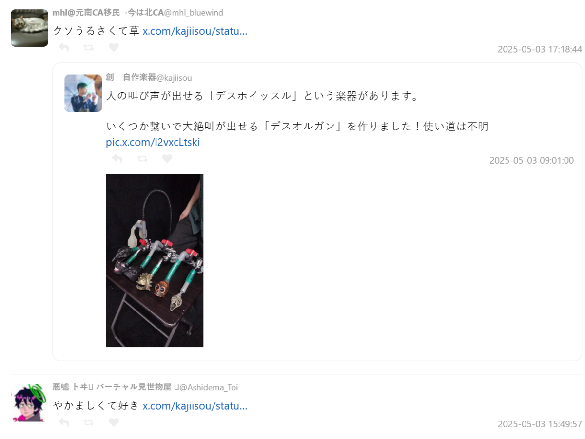 雖然目前這台「死亡風琴」沒有明確的應用方向,但無疑展現出對聲音藝術的瘋狂熱愛與實驗精神。只能說民間高手真的是讓人驚嘆阿,沒想到用這些材料居然可以製作成樂器,甚至還能精準地發出音階聲色。對推主創自製樂器有興趣的朋友,也可以瀏覽一下他的 X ,上面分享不少他的趣味作品唷 !