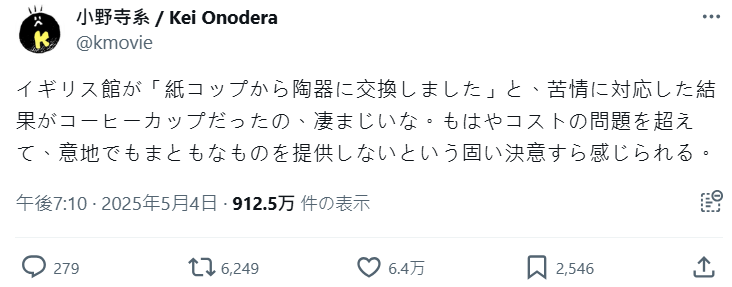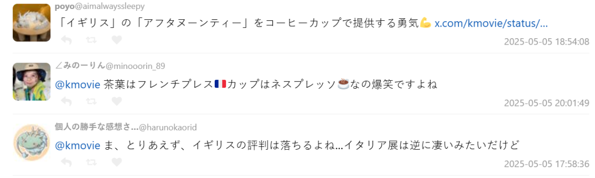電影評論員小野寺系就抱怨:「英國館說把紙杯換成陶瓷杯了,結果換出來的是咖啡杯,這已經不是成本問題,是不想好好做的堅定意志。」他進一步指出,同樣價格在日本吃下午茶,體驗都更道地,質疑「為何英國館反而做成這樣?」