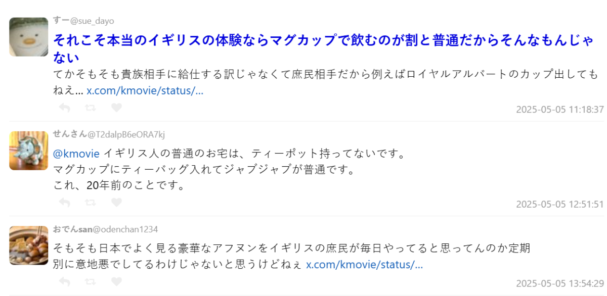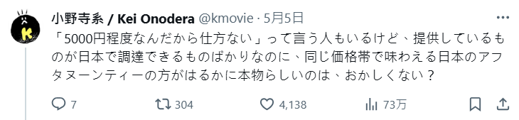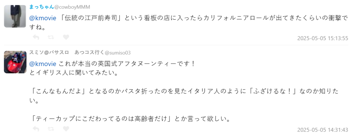 對於這場「英式下午茶災難」,有網友用更具體的比喻諷刺:「這就像走進一家寫著『傳統江戶前壽司』的壽司店,結果上來的是加州卷一樣,衝擊太大。」