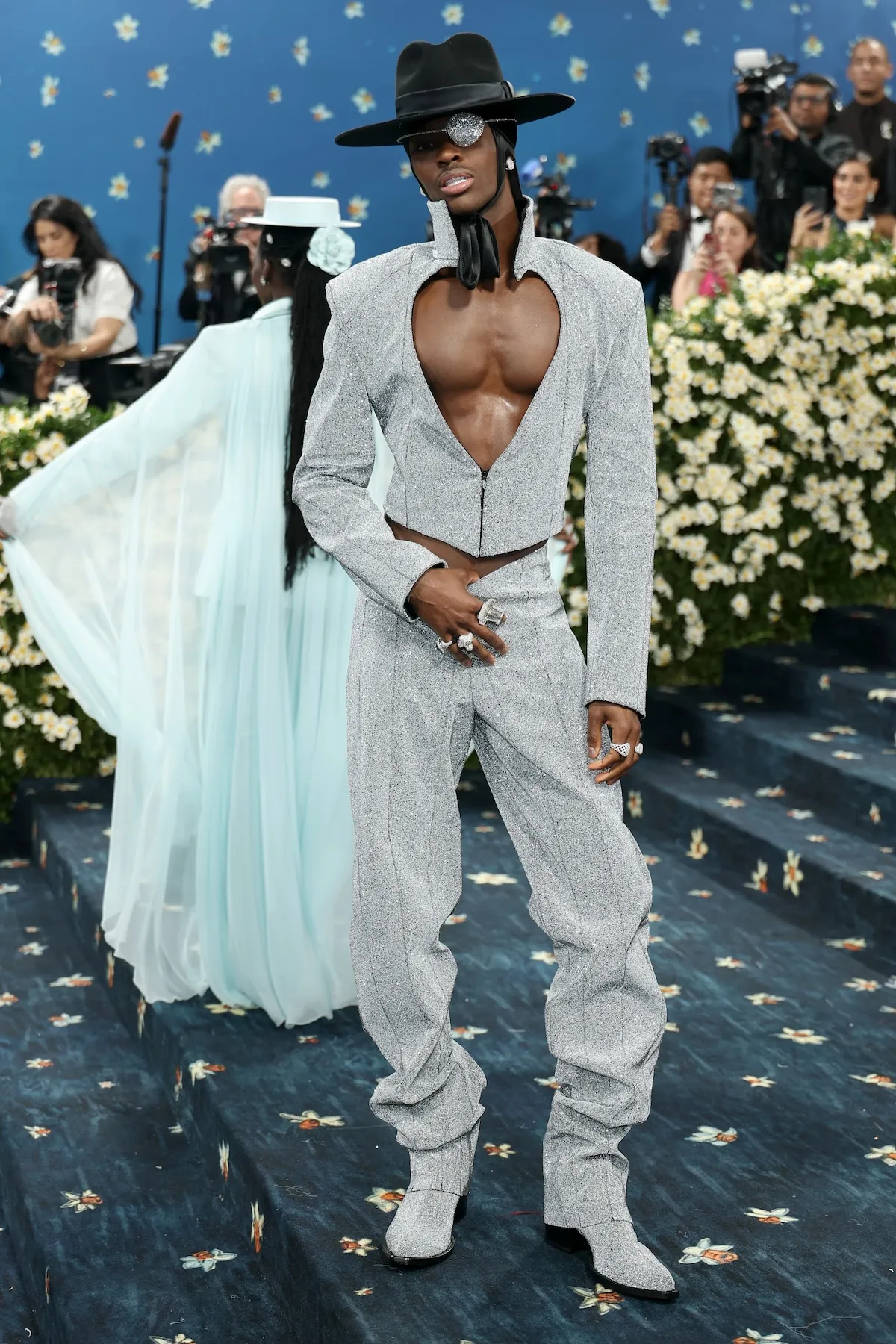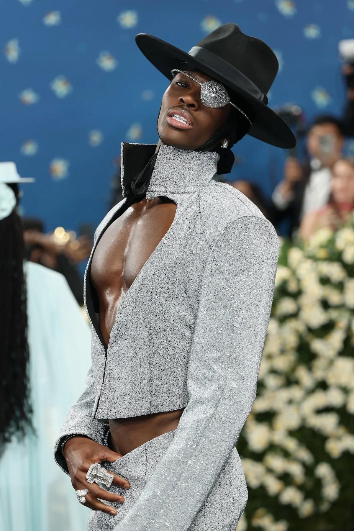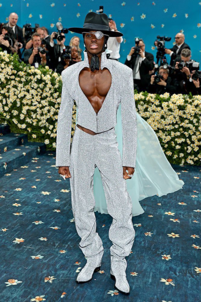 這次在Met Gala紅毯上,他選擇以黑銀配色的剪裁西裝登場,並巧妙融入喬魯諾最具代表性的心型挖空設計。雖然原作角色配色是紫色,但他特地改以更具時尚感的黑銀色調詮釋,搭配黑色紳士帽與銀色閃耀的眼罩作為配飾,讓整體造型看起來更洗鍊、更具高級感。