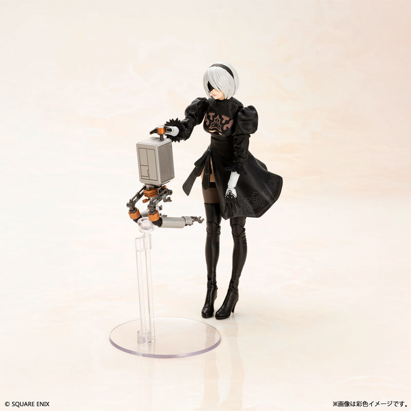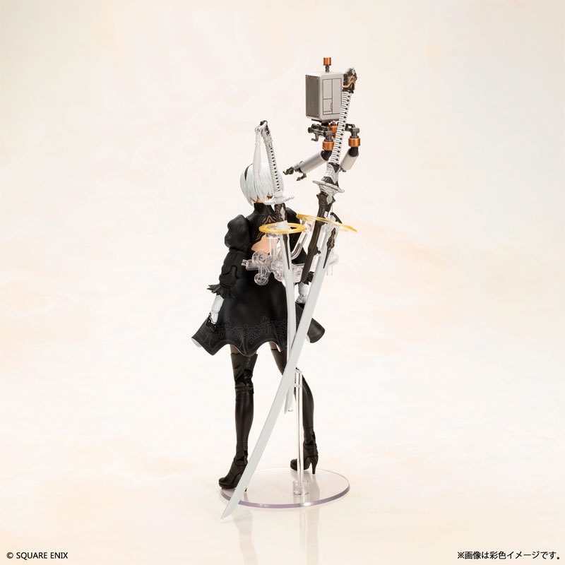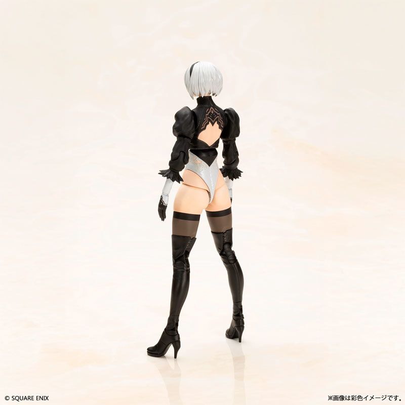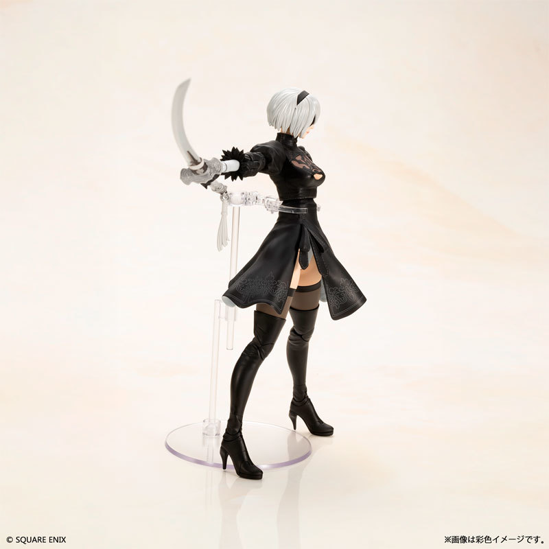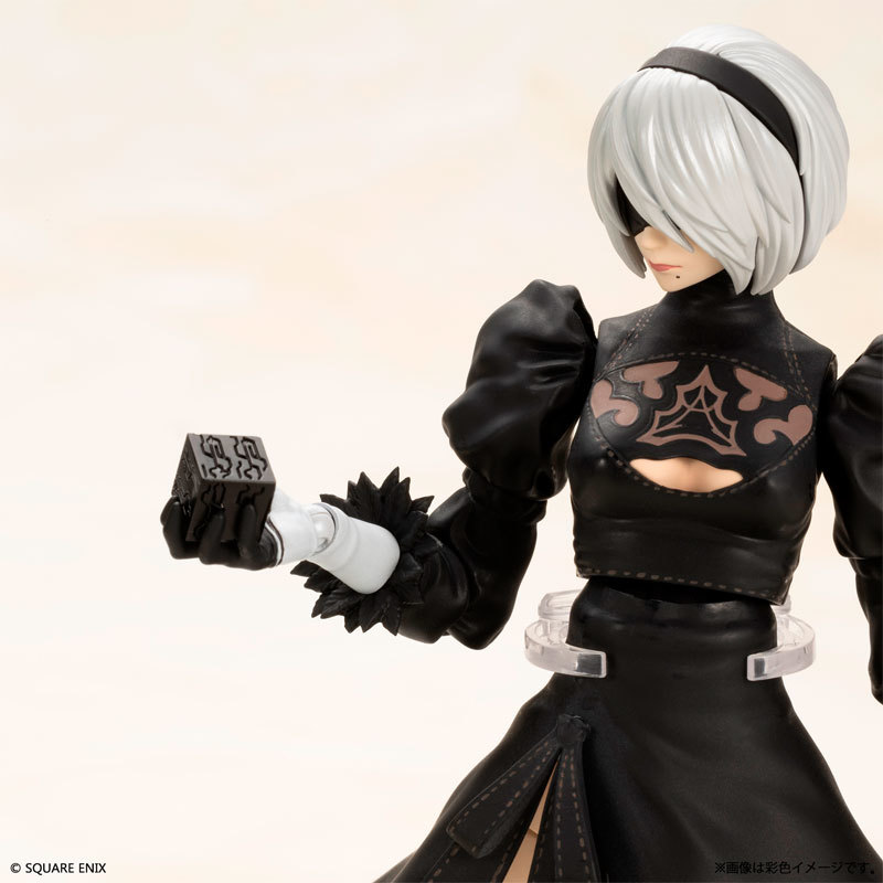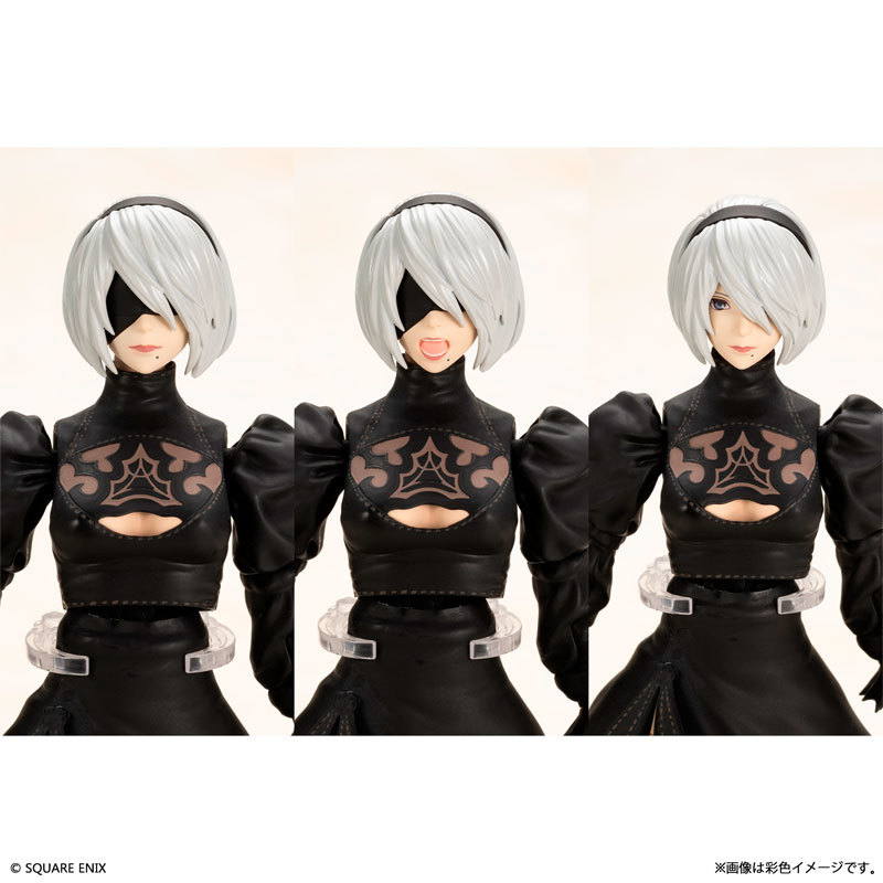 「2B 可動組裝模型」基於遊戲中使用的 3D 模型進行開發,結合壽屋長年設計美少女組裝模型的技術,完成後全高約 15 公分,忠實再現遊戲中 2B 的豐滿體態曲線、優雅的服飾造型,並附有再現瞳孔圖樣、裙襬刺繡的貼紙。