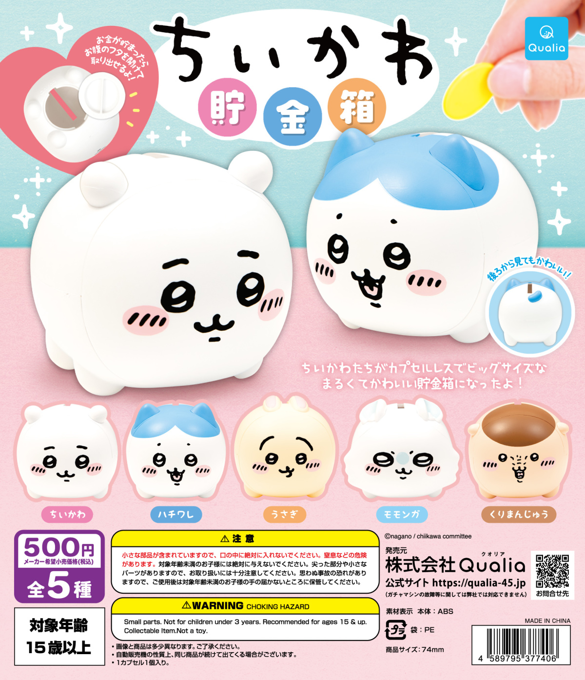 Qualia「吉伊卡哇 存錢筒」轉蛋,將人氣角色化身為轉蛋尺寸的掌中存錢筒,收錄有:吉伊卡哇、小八貓、兔兔,以及小桃、栗子饅頭五種款式,無轉蛋殼的設計,讓整體份量感最大化,又大又圓的胖胖模樣,從背面看也很可愛~等存夠錢了就可以打開腹部的蓋子,領錢啦!