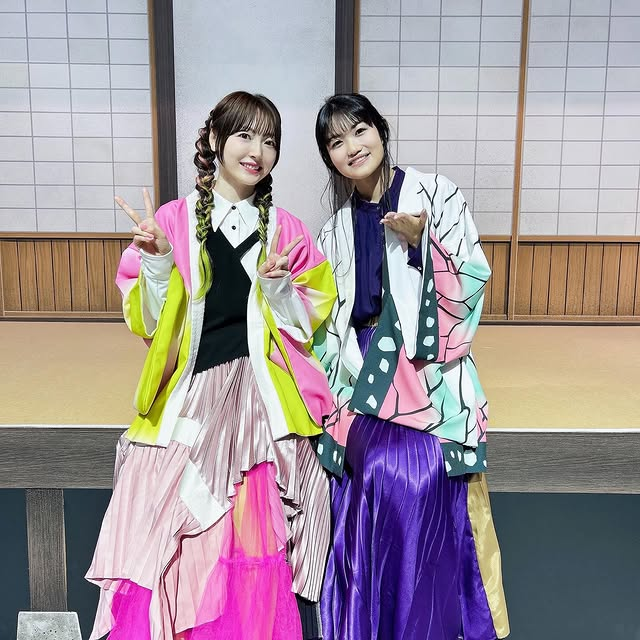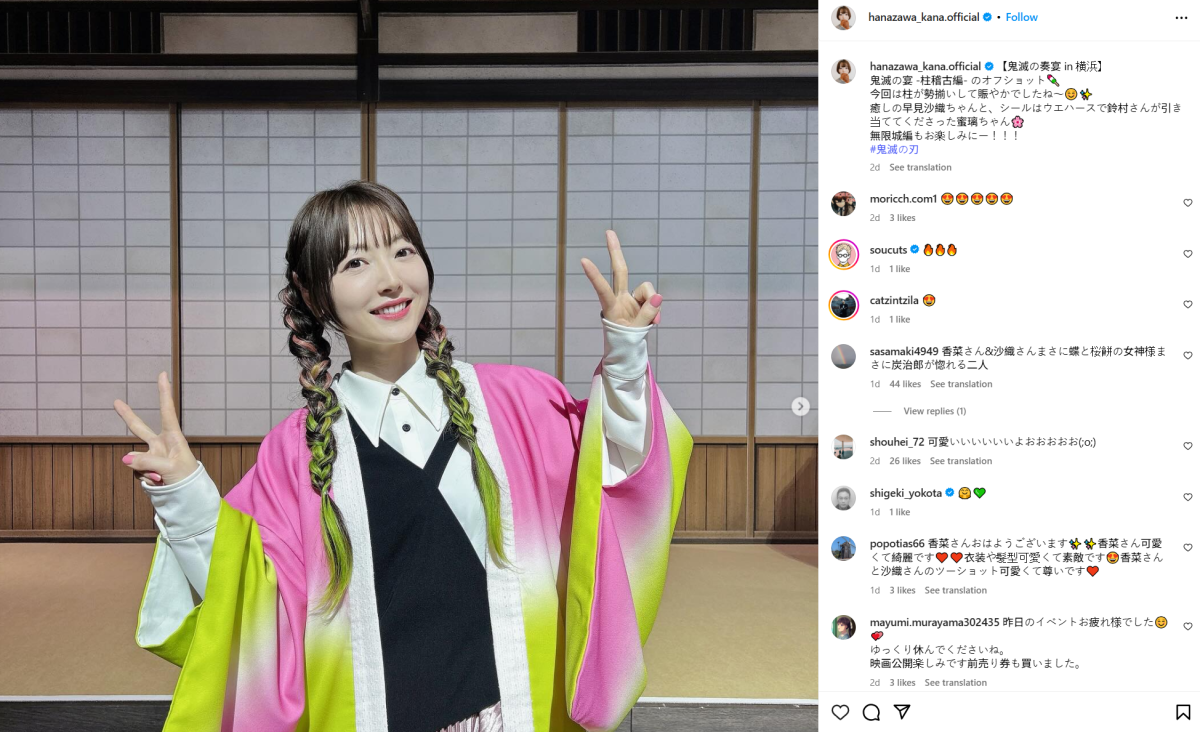 當天穿上粉紅加黃綠漸層配色的羽織,還綁了招牌三股辮,整個就是蜜璃的模樣。她還在貼文中分享了和飾演胡蝶忍的早見沙織的合照,以及伊黑小芭內聲優鈴村健一抽到的角色貼紙等活動幕後花絮。