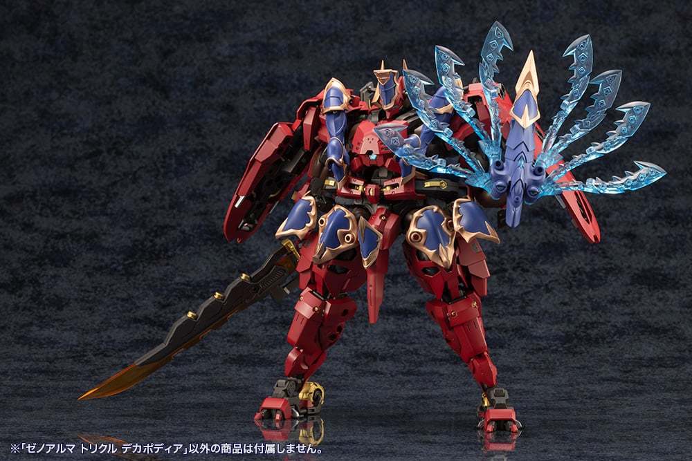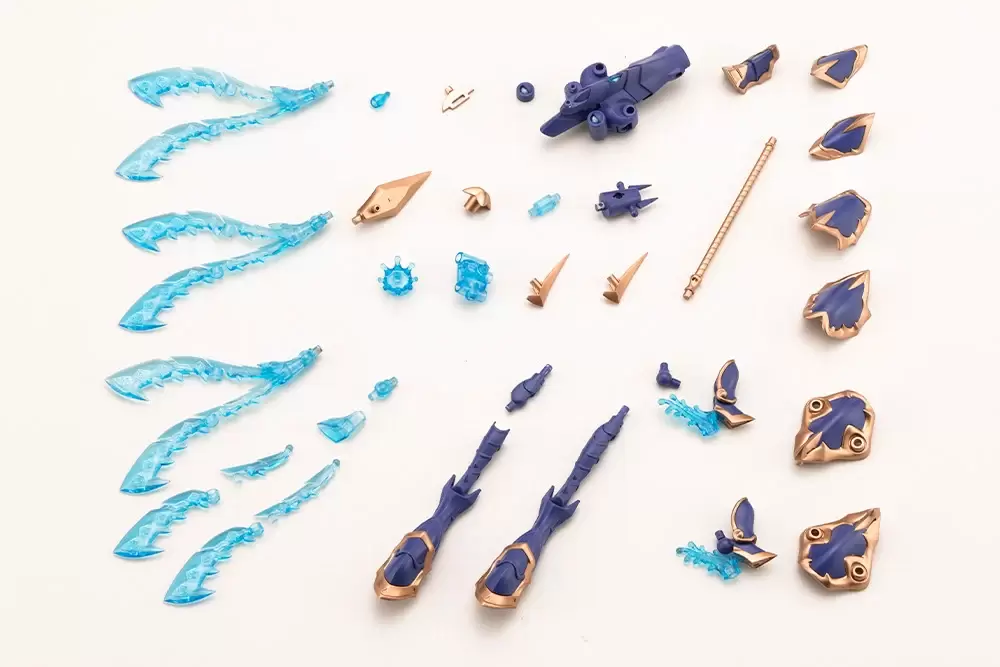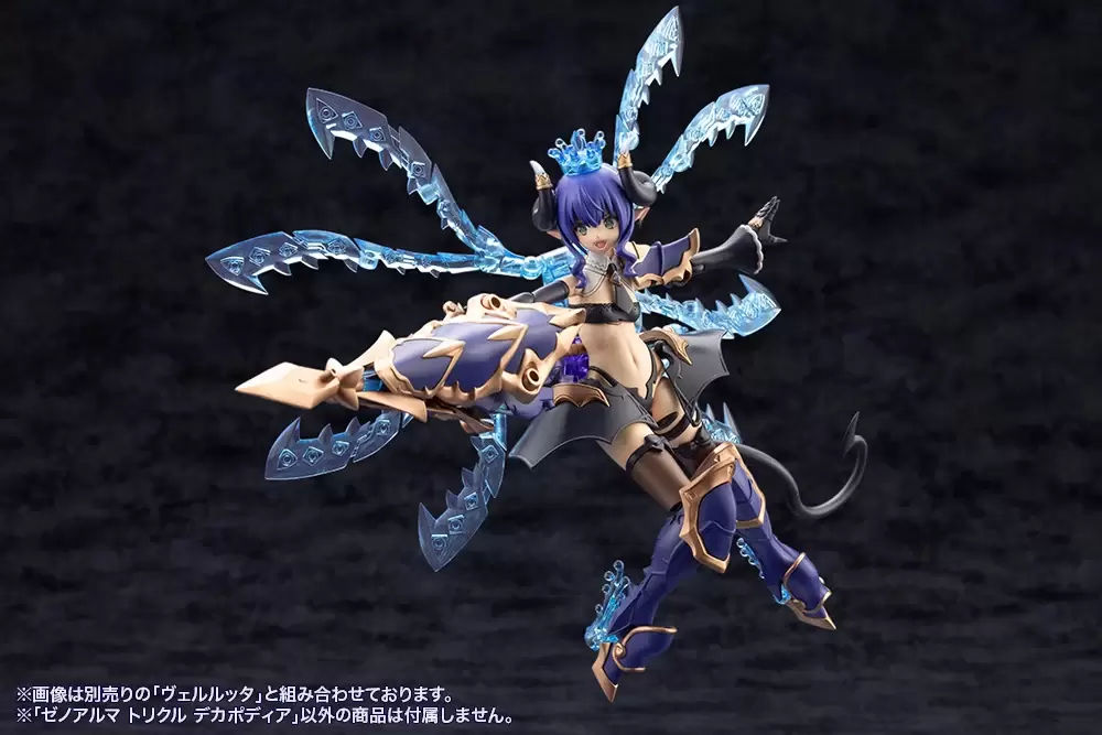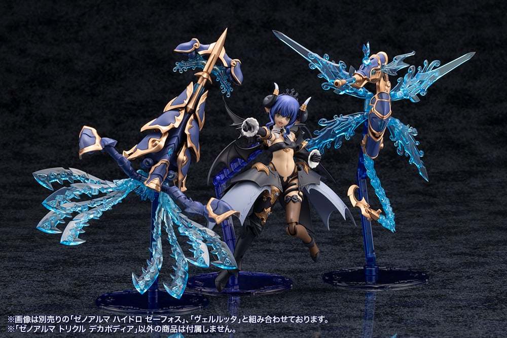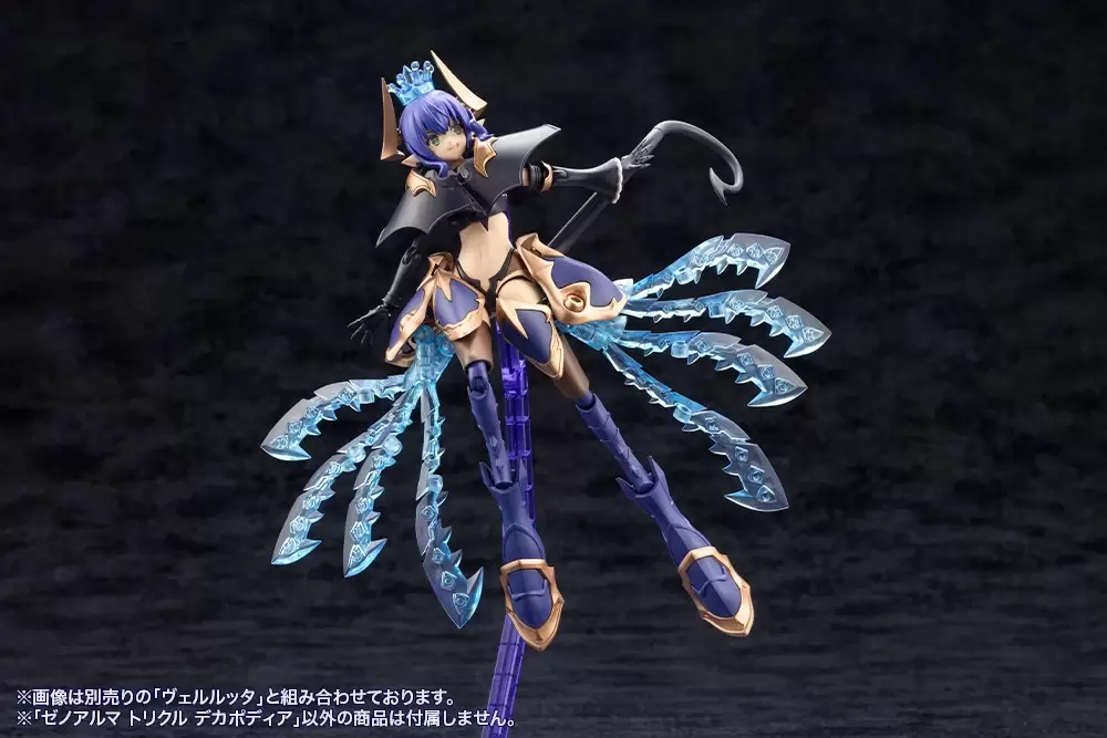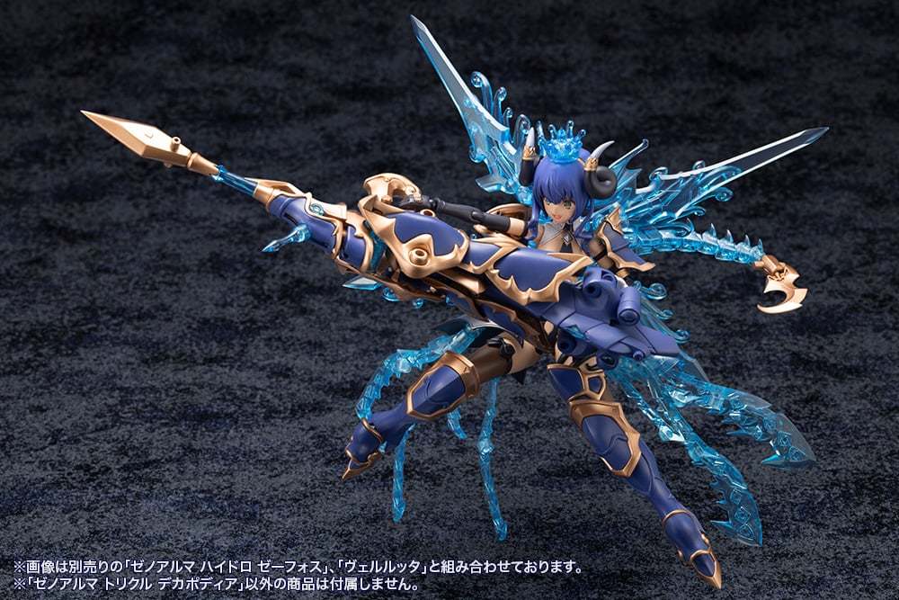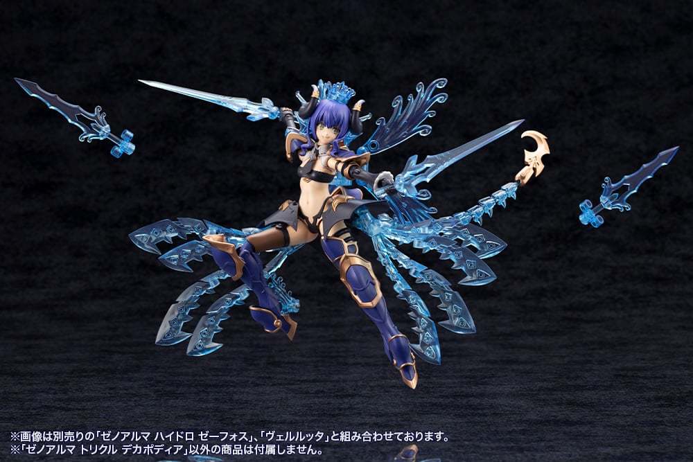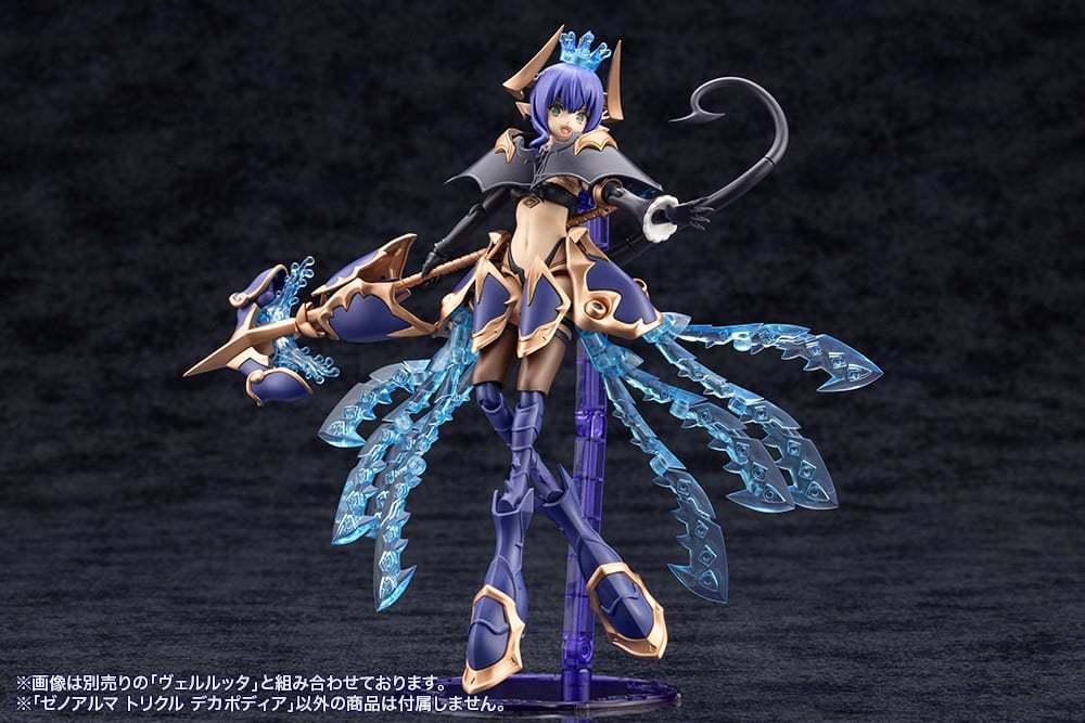 在「武裝模式」下,「Trickle Decapodia」全身能夠拆解成王冠、肩甲、背部觸手組件、腿部裝甲、長槍等豐富配件,與同為水屬性的薇兒蕾特擁有高度適性,透過 3mm 規格連接軸、各部可動機構組成多樣武裝形態。