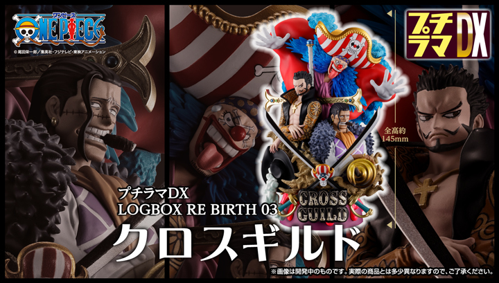 「ONE PIECE LOGBOX RE BIRTH 03 十字公會CROSS GUILD」盒玩,以由王下七武海的三位前成員巴其、克洛克達爾、喬拉可爾·密佛格組成的強大的組織十字公會為主題,在約 14 公分的小尺寸中刻畫出充滿威嚴且生動的造型!透過巴其誇張又引人注目的姿勢,鷹眼不離身的巨大武器無上大快刀-夜,以及克洛克達爾的沙子等,組成豐富、高密度的立體場景!