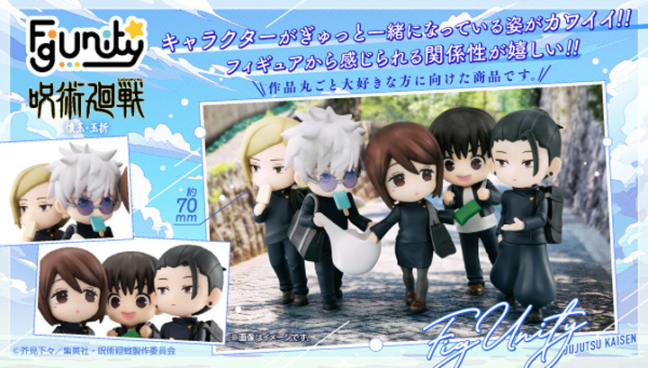 以「Figure」與「Unity」結合為概念的「FigUnity」Q 版模型系列,意在強調角色之間的情誼與羈絆,傳達對作品的熱愛。「FigUnity 咒術迴戰 懷玉・玉折」,由五條悟、夏油杰、家入硝子、七海建人、灰原雄五人組成,在約 90 mm 的小尺寸中,刻劃出動畫片尾曲中,五人在咒術高專時期,放學一起吃冰棒的青春悠閒時光~(小七海實在是太可愛了吧)