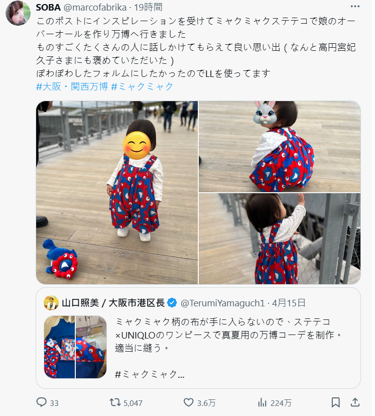 這篇文章引起關注後,推主老婆也發文表示自己的創意其實來自 4 月時大阪港區區長山口照美的示範,只要買得到世博脈脈的布料圖案,就可以輕鬆動手改造,任何衣服款式都可以搭配圖案製作。