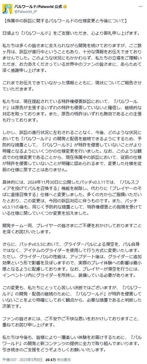 具體來說,我們在 2024 年 11 月 30 日推出的 v0.3.11 更新中,移除了「丟帕魯球把帕魯叫出來」的功能,改成「直接在玩家身邊召喚帕魯」。如同許多玩家猜測的,這項調整確實是因應訴訟風險而做出的。同時,我們也針對其他可能被誤認為侵權的設計做了一些修改。對於這些改動造成的不便,我們開發團隊真的感到很抱歉。