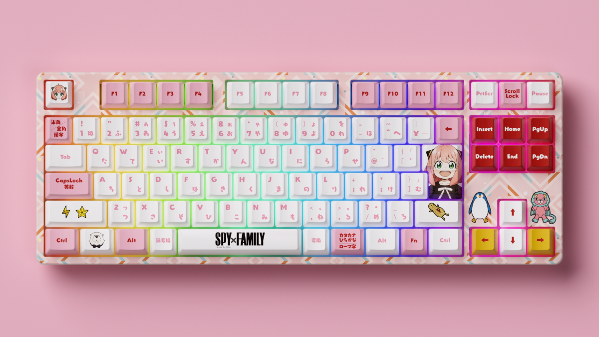 這款鍵盤融合了《SPY×FAMILY 間諜家家酒》的多種元素設計,可以看到鍵盤上有著各種圖案,像是彭德、奇美拉娃娃與企鵝曼,更有安妮亞最喜歡的花生都在其中。不只可愛,還超有誠意!採用無數字鍵(Tenkeyless)設計,大小適中,不管你的桌面空間大或小都很好擺!