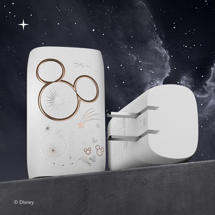 閃耀登場的還有這款 Belkin x Disney 聯名充電頭,可輕巧貼牆的機身設計,便於攜帶與收納,不論辦公、旅途還是居家使用都合適,外觀以經典米奇頭的輪廓線為主體元素,搭配反光就會閃閃發亮的星星圖案,及設計感十足的豐富線條,讓充電彷彿不再只是稀疏平常的日常小事,而是充滿驚喜的奇幻能量注入儀式!