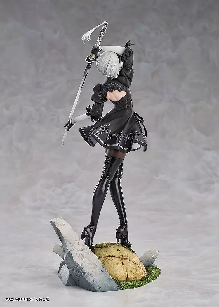 GOOD SMILE COMPANY「2B(寄葉二號B型)」1/7比例模型,尺寸全高約 30 公分,重現2B手握「純白契約」的優雅戰鬥姿態,仔細刻劃特徵的開胸衣與飄逸的裙襬,大腿長靴更是施以光澤感的塗裝表現材質差異;將手高舉的持劍姿勢,強調2B修長的身體線條,小露香背與裙底若隱若現的肉感大腿也是一看點!底座則是長滿青苔的機械生命體殘骸與碎石,令人感受到作品獨特的世界觀之魅力。