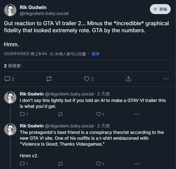 在 BlueSky 社群平台上,Ubisoft 最新作品《刺客教條 暗影者》(Assassin’s Creed Shadows)DLC《淡路獵爪》(Claws of Awaji)的編劇 Rik Godwin 發文表示,他對《GTA VI》第二支預告片的第一反應是:「除了令人讚嘆但極其制式的圖像品質之外,整體給人的感覺就像是按表操課的 GTA。」他補充道:「如果你讓 AI 生成一支《GTA VI》的預告片,大概就是這樣。」