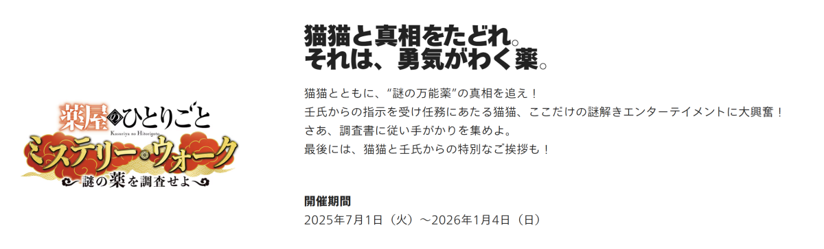 「薬屋のひとりごと ミステリー・ウォーク ~謎の薬を調査せよ~」將於 2025 年 7 月 1 日~ 2026 年 1 月 4 日限期舉辦,約莫半年,想衝一波的朋友仍有時間考慮看看何時比較方便前去遊玩喔 !