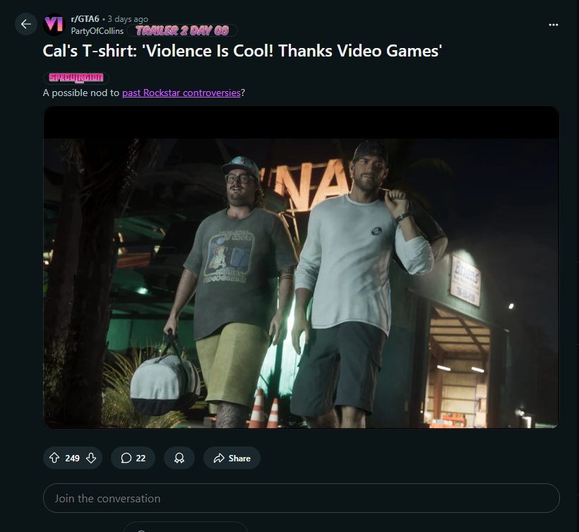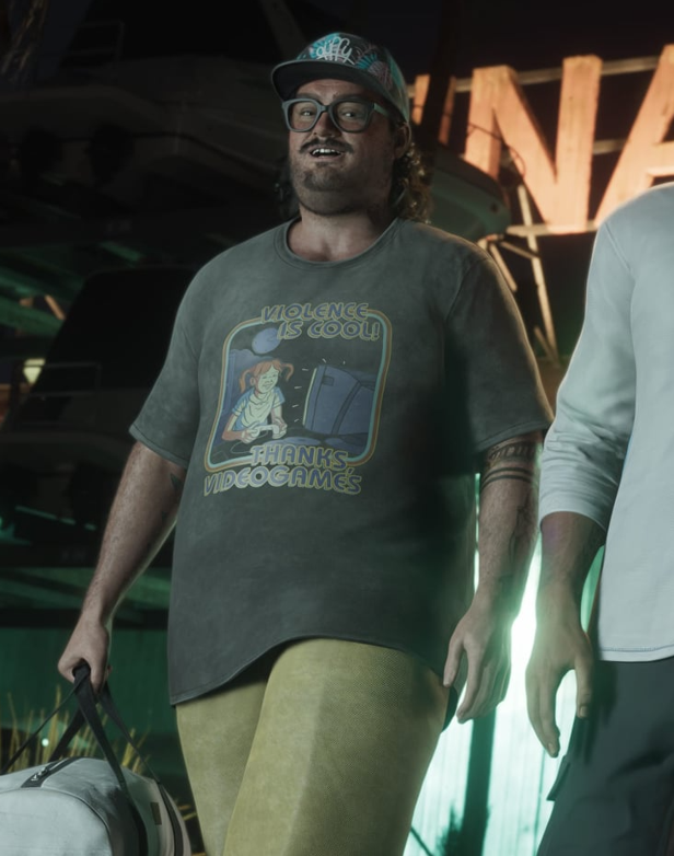 除了令人忍不住細看每個預告細節之外,許多玩家的目光也被配角卡爾·漢普頓(Cal Hampton)身上的一件 T 恤吸引——上頭寫著「暴力超棒!感謝電玩(Violence Is Gool; Thanks Videogames)」。