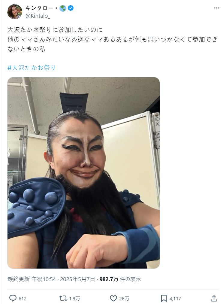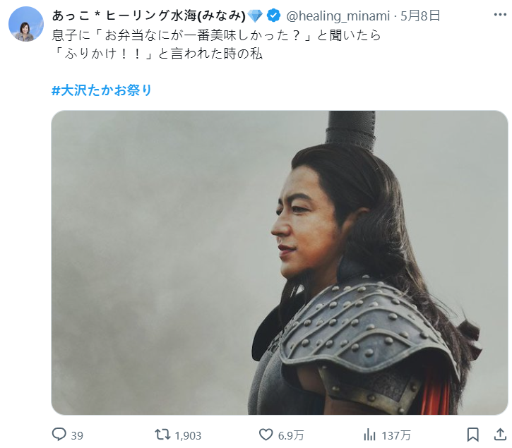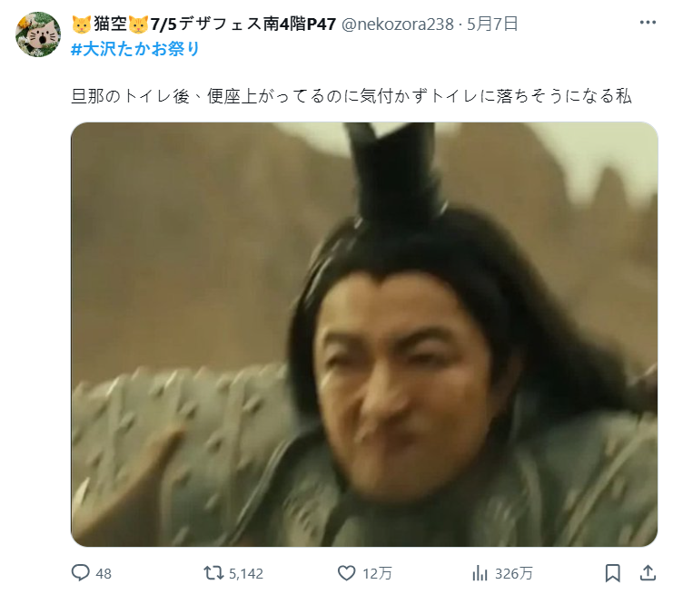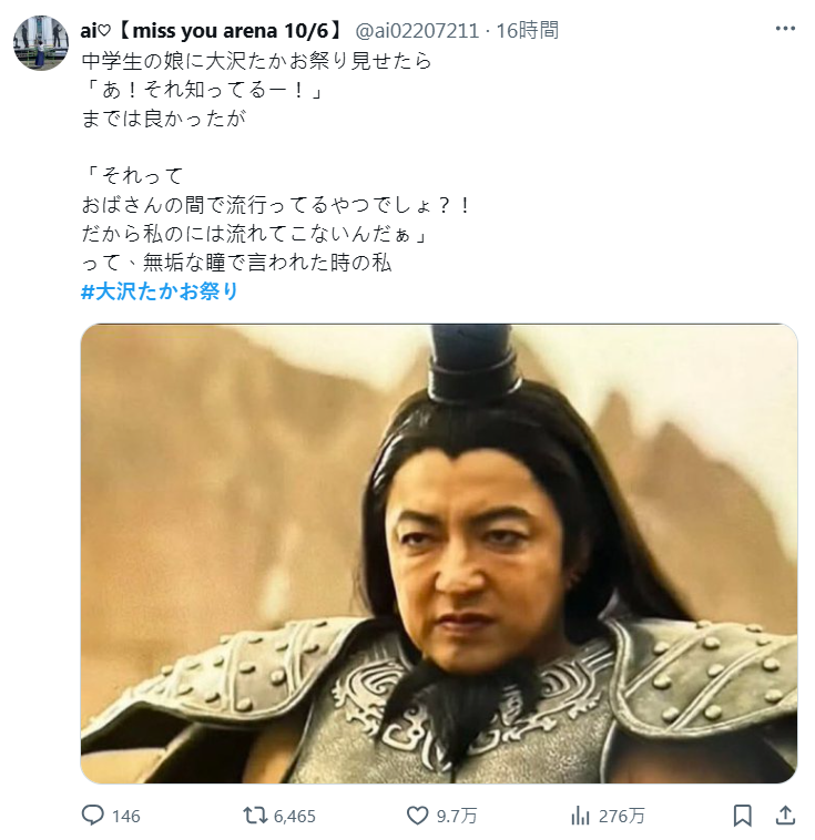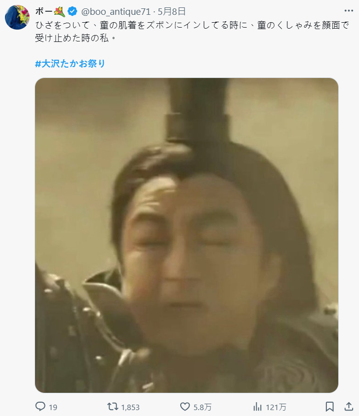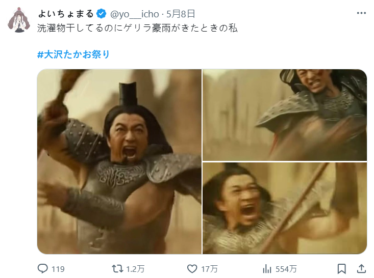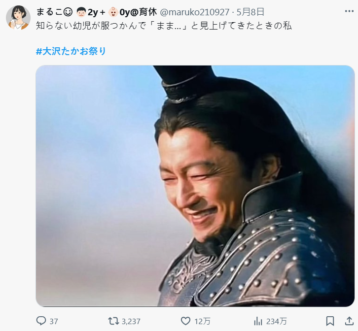 沒想到最近在日本社群上,掀起了一個「大沢たかお祭り」( 大澤隆夫祭 ) 的迷因風潮,許多人在網路上扮成《王者天下》的「王騎將軍」。大家會扮成王騎,配上各種生活中媽媽會遇到的「日常小劇場」,變成一種超中毒性的迷因。