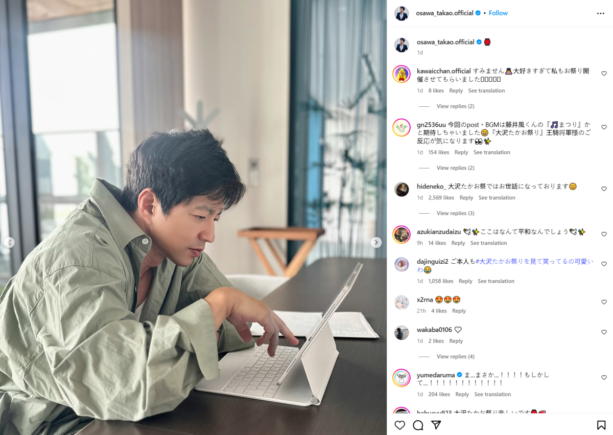 不過這則風潮,似乎傳到大澤隆夫本人去了,大澤隆夫在 5 月 8 日發布 IG 照片,曬出幾張他拿著平板、露出意味深長笑容的照片,貼文中還特地放上一個「」的 emoji。結果這個細節瞬間被眼尖粉絲抓到,因為「」正是迷因中「大澤隆夫祭」的代表圖案之一!
